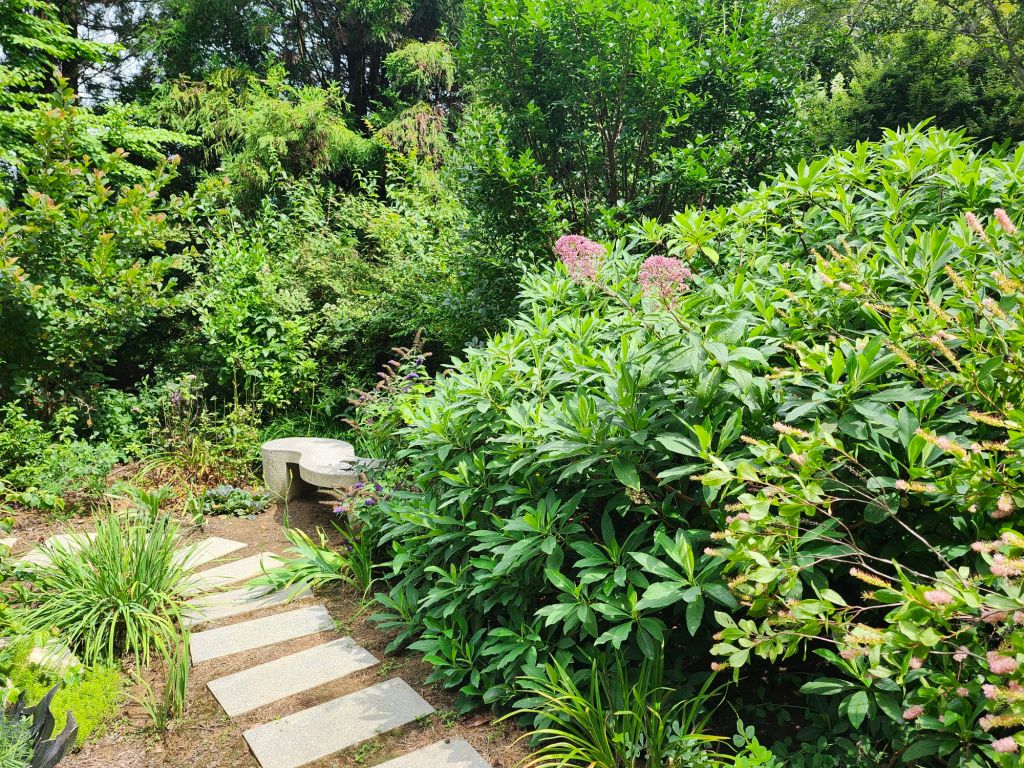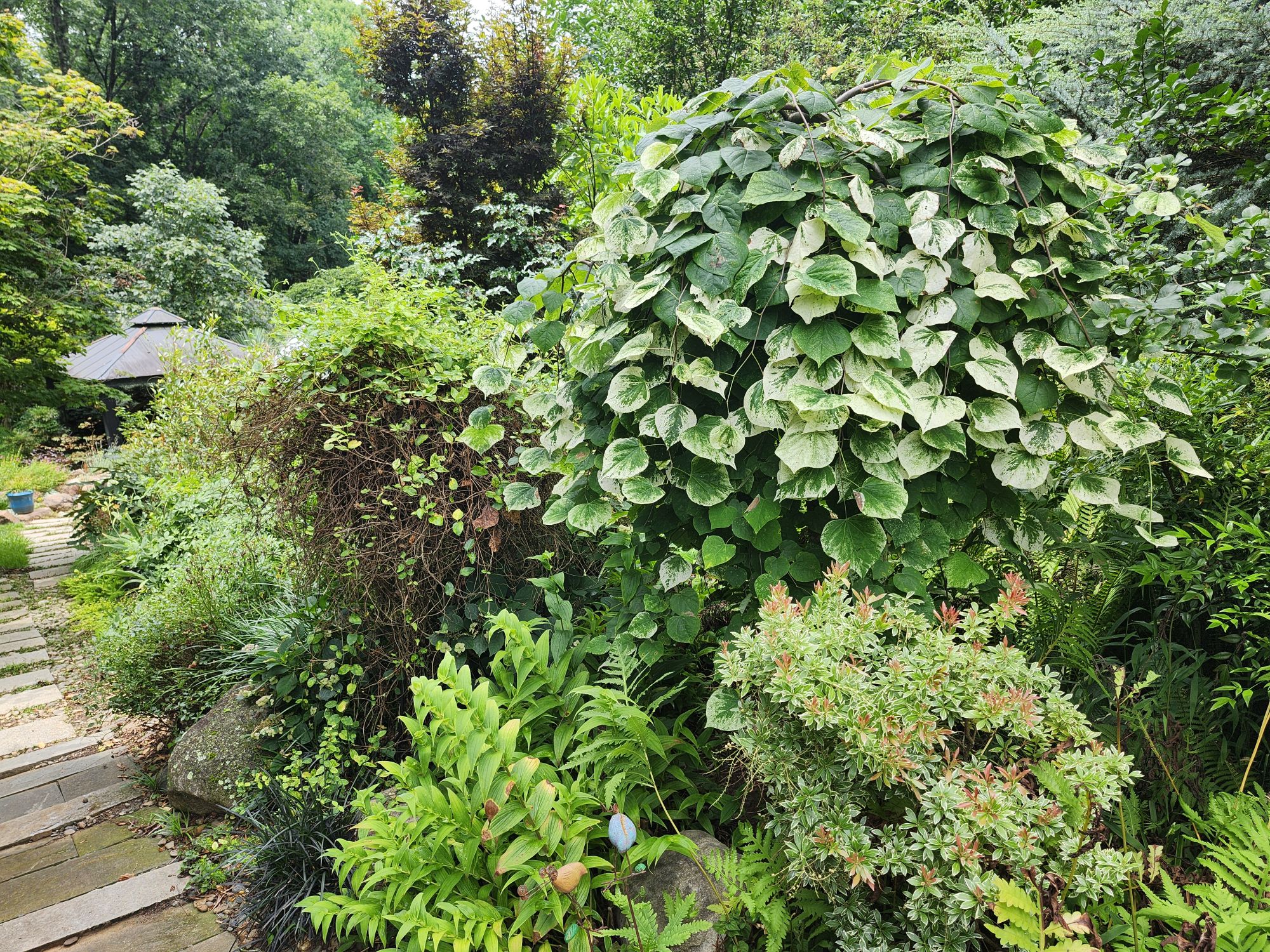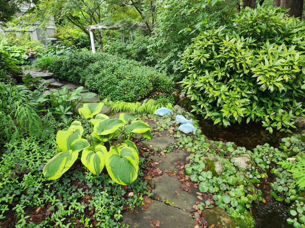 I must continually balance care of this garden. At what point is my hand too intrusive (rarely) or too light? I am not the only human occupant of this garden, so I must not allow patios to become overly cluttered by debris or paths to be obstructed by overhanging foliage. Certainly, birds, bees, and other beasts care little, but Barbara occasionally lends a helping hand to chop stems of hostas and mountain mints that carelessly stray over stone paths.