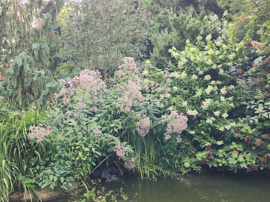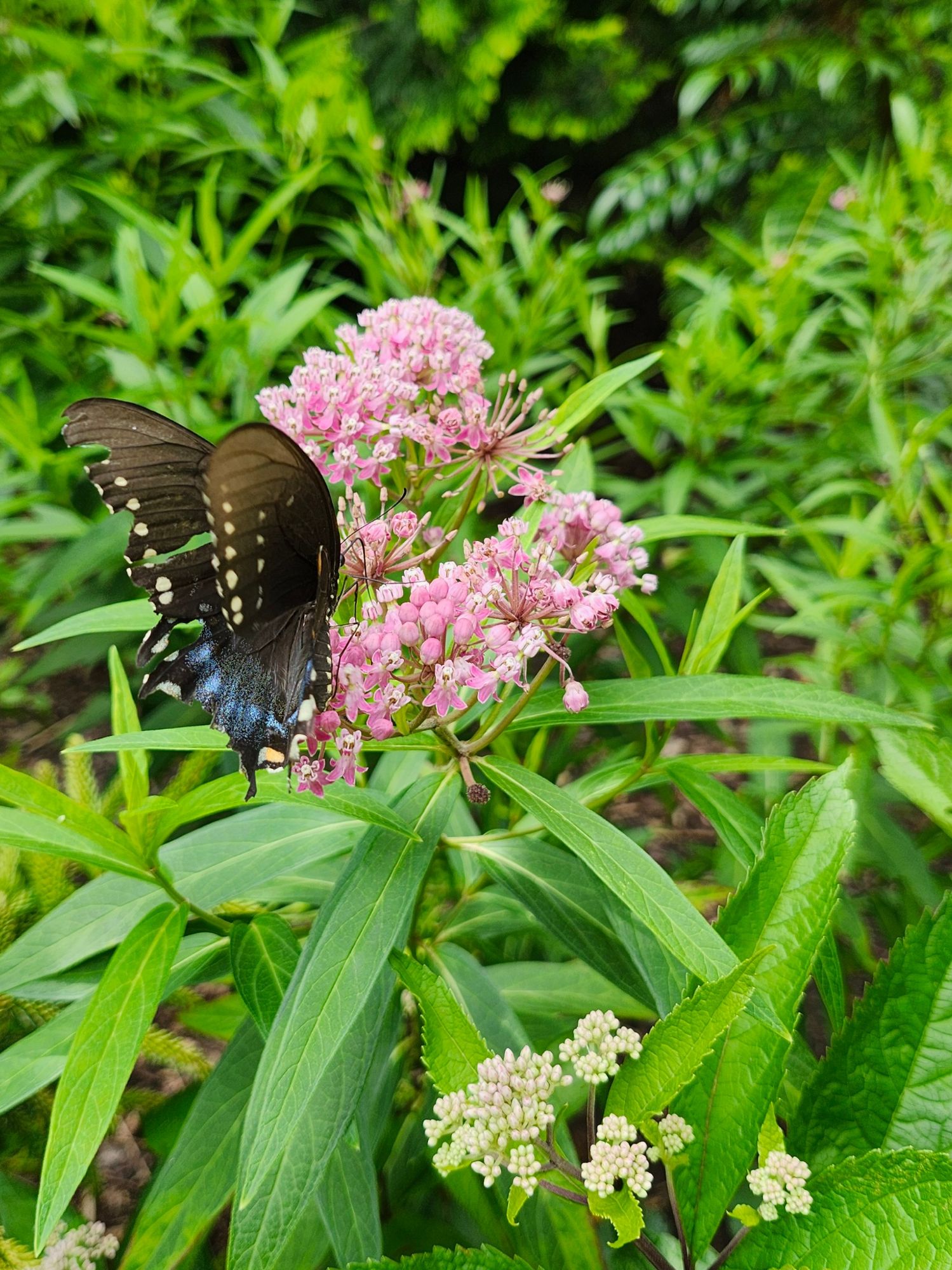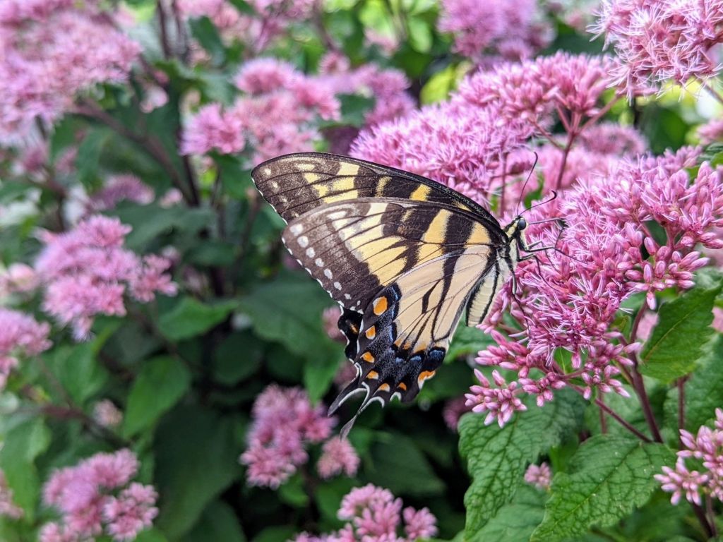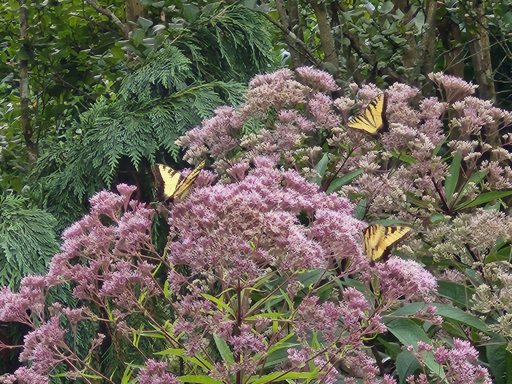 While Joe Pye seedlings must often be discarded, I see that taller seedlings of the native now mass behind irises on the far side of the koi pond. Bees are occupied elsewhere, so dozens of Tiger swallowtails take advantage of the calmer setting.