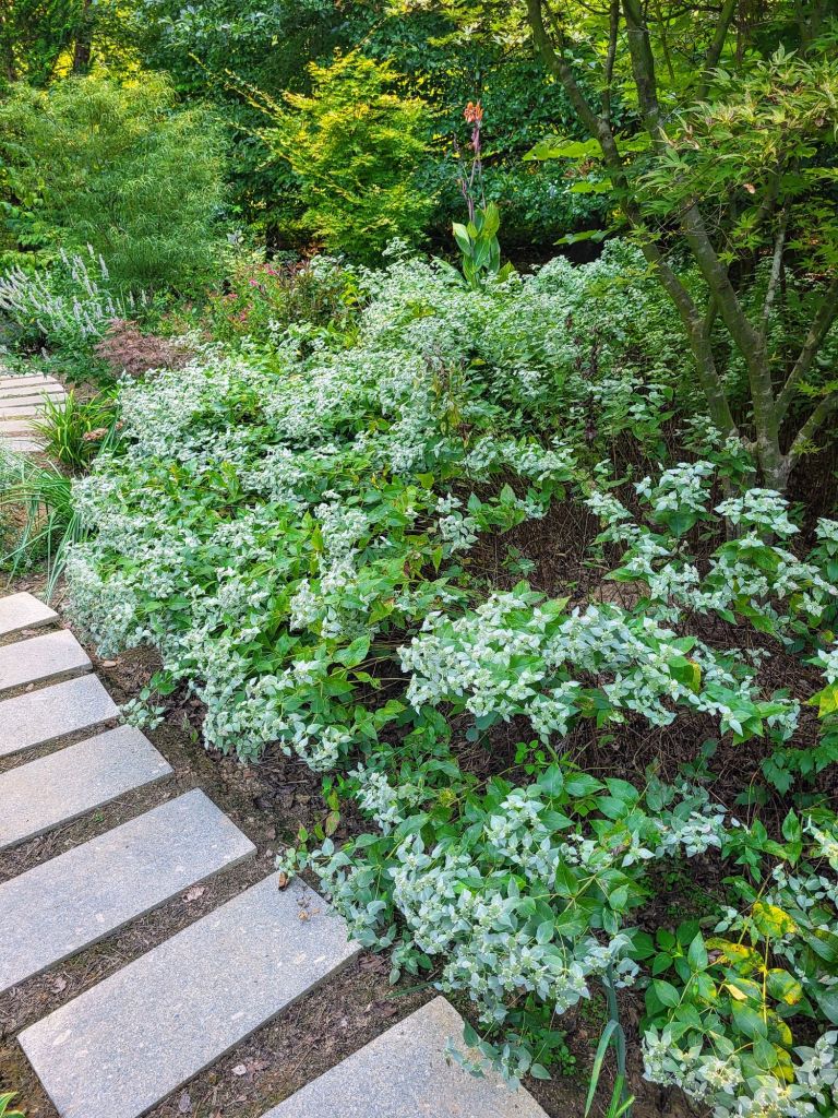 The wide spreading mountain mint (Pycnanthemum muticum, below) is aptly described as a colony in this garden rather than a clump, covering an area of damp ground to host hundreds, perhaps thousands of pollinating insects while the sun is shining. While it spreads vigorously, I have little doubt in recommending mountain mint since spreading growth is easily controlled.