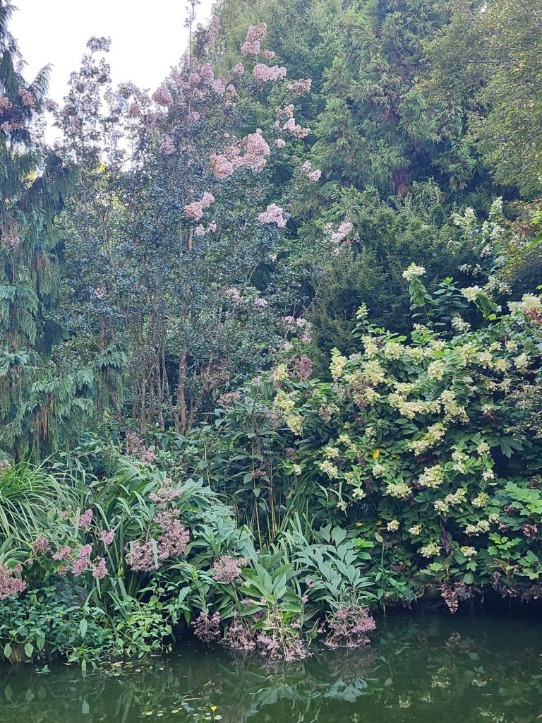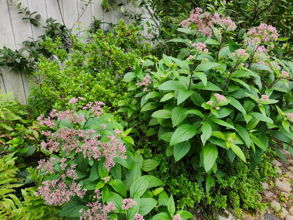 Before the storm, the water level in the koi pond had dropped considerably after weeks of drought, so the partial refill was welcomed. Unfortunately, top heavy, waterlogged flowers of tall Joe Pye weeds bordering the pond have flopped and submerged in the pond to be inaccessible to swallowtails (above). There are several still standing on the near side of the pond, and others chomped by deer in late spring that are just coming into flower (below). It’s difficult to get through the dense planting surrounding the pond, so it’s unlikely I’ll pull the flower heads out until the late winter cleanup.