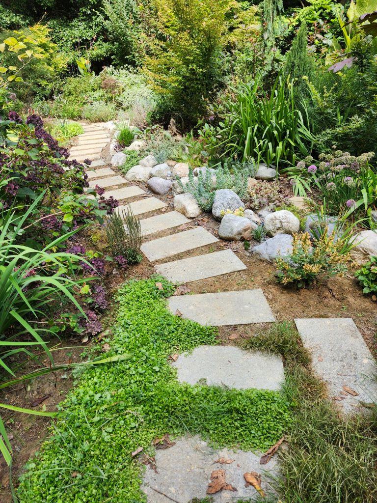 Trenchs dug several years ago for drainage in the damp, lower rear garden were puddled in water for several days following the storm. That’s dried up, but the dampness has encouraged a fresh crop of weeds in the areas of bare ground. Anticipating the rainfall, I planted into the shallow ditch a few days earlier, with plans to transplant several ground covers with cooler temperatures in September to lessen annoying maintenance. I expect that a year from now, I’ll whine that arching stems of overly vigorous perennials are obstructing the path (below).