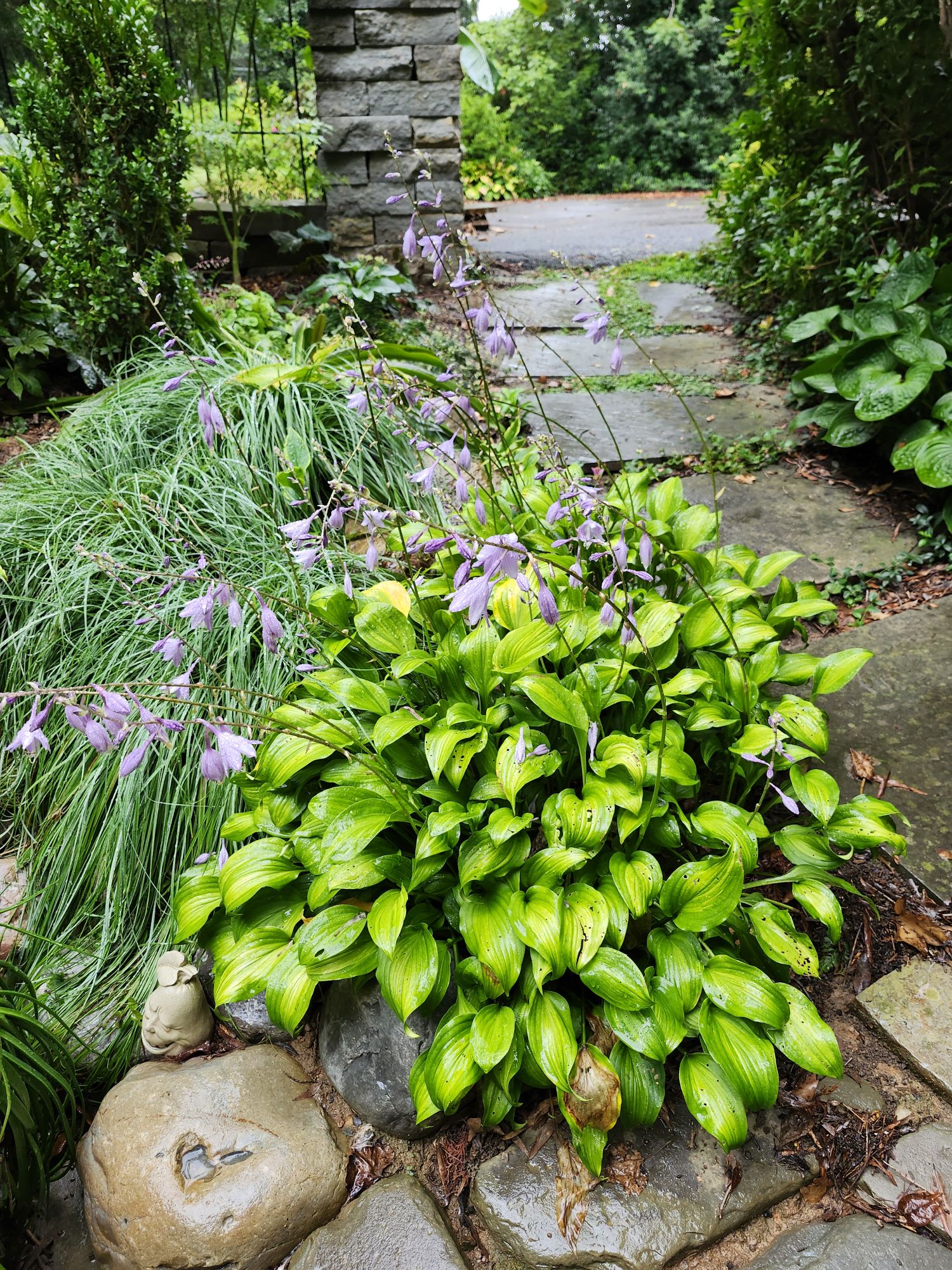 A long established hosta with subtle green and yellow variegation, one that I long ago forgot the name of along with several dozen others, is a current favorite of hummingbirds. The long, tubular flowers in early September, long after others have faded, are ideally shaped for hummers so that the tiny birds spend considerable time visiting each bloom before moving on.
