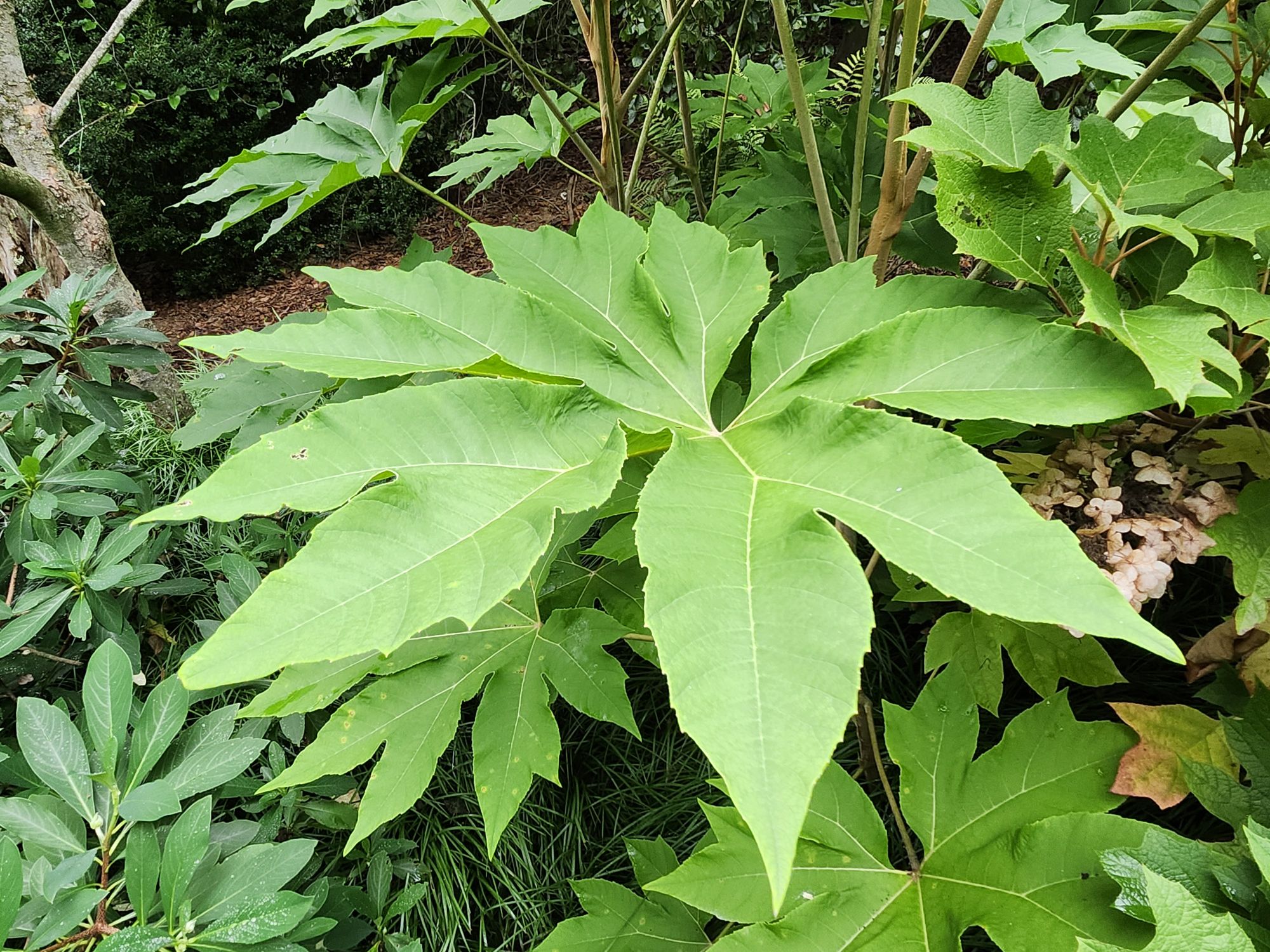 The tetrapanax has nearly filled the open space by the koi pond once occupied by a dark leafed ‘Diablo’ ninebark (Physocarpus opulifolius ‘Monlo’) that was chopped out when it became too shaded. In the first year, the rice paper plant grew only to waist height, but the following year, it doubled in size and added a few stems. A few years later, it’s grown to eight or nine feet with multiple stems. Next year, it’s likely I’ll cut back any new emerging growth to limit its spread. It’s easily controlled, and with monstrous leaves, it’s a favorite.