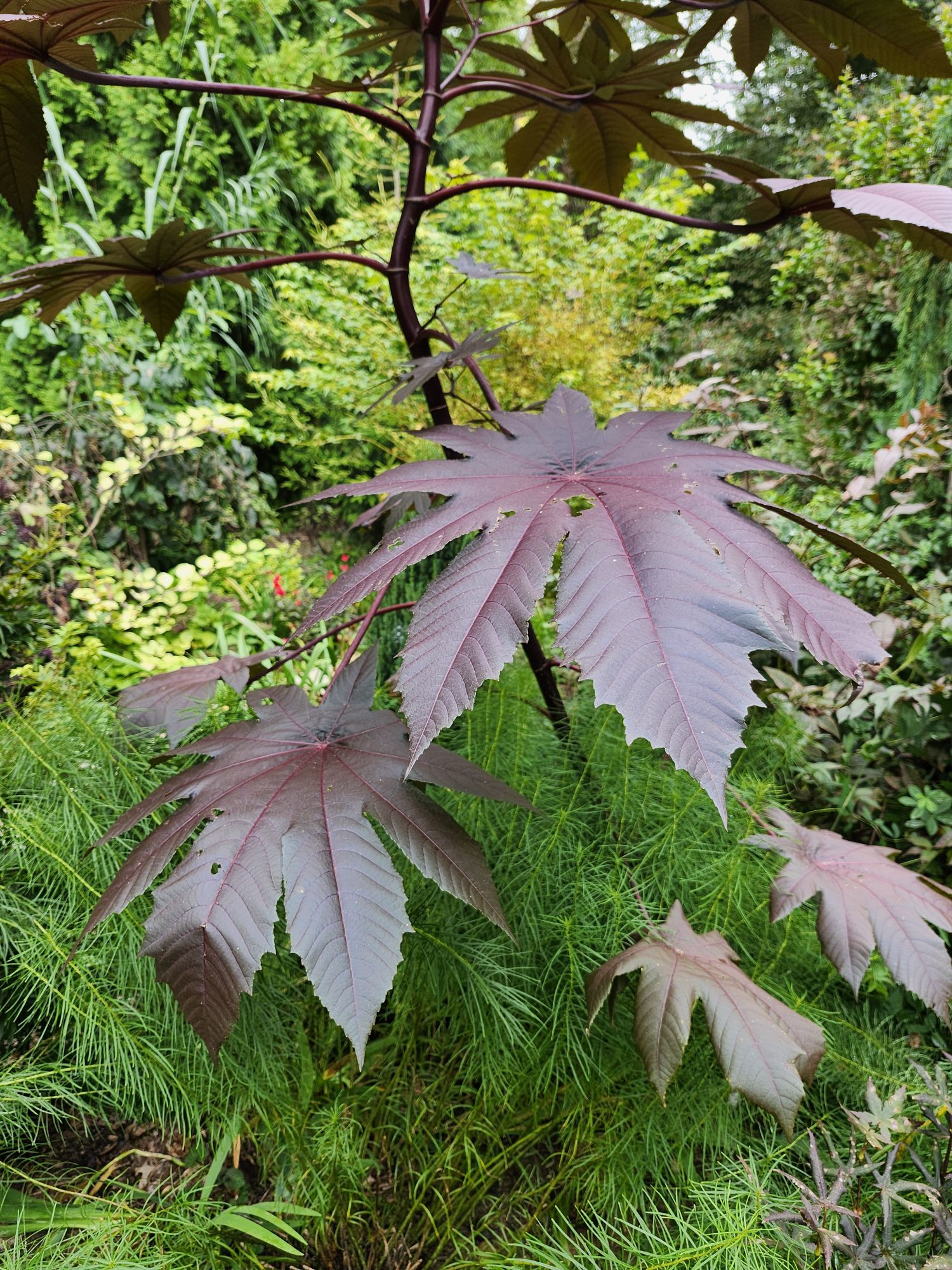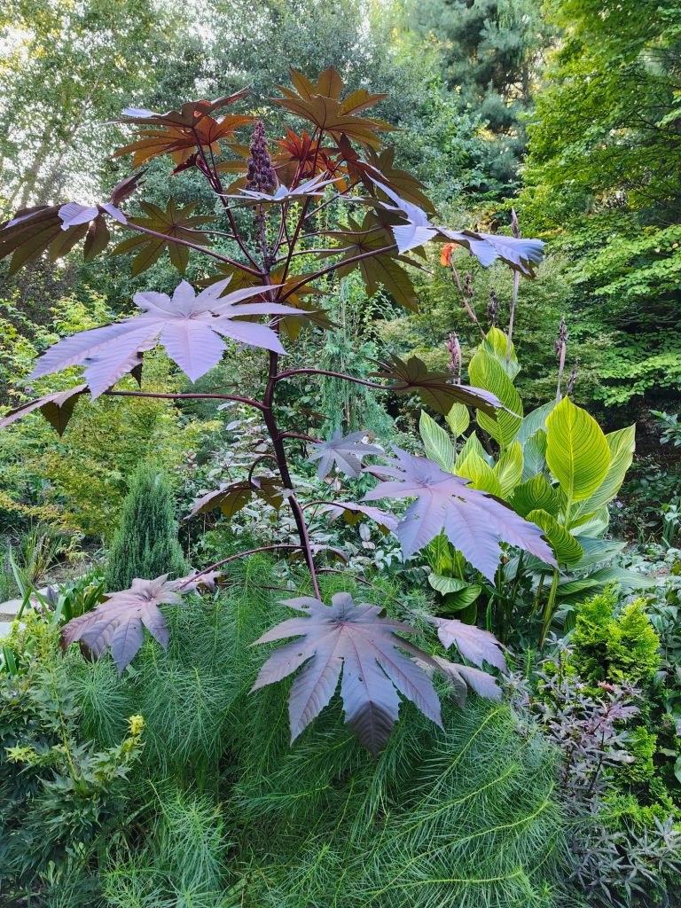 Occasionally, cannas will survive winter freezes and begin growing by late spring, but midway through when there were no signs of growth, this year’s filler was a dark leafed castor bean (Ricinus, above). But, soon after the castor bean was planted, the first sign of growth of the canna poked above ground, and a month later, ‘Bengal Tiger’ had returned in full. So now, there are two large fillers, perhaps too close, but I’m overjoyed by too much instead of too little. The castor bean won’t make it through the winter, but I might plant another in the spring to join the canna that’s here to stay, I expect.