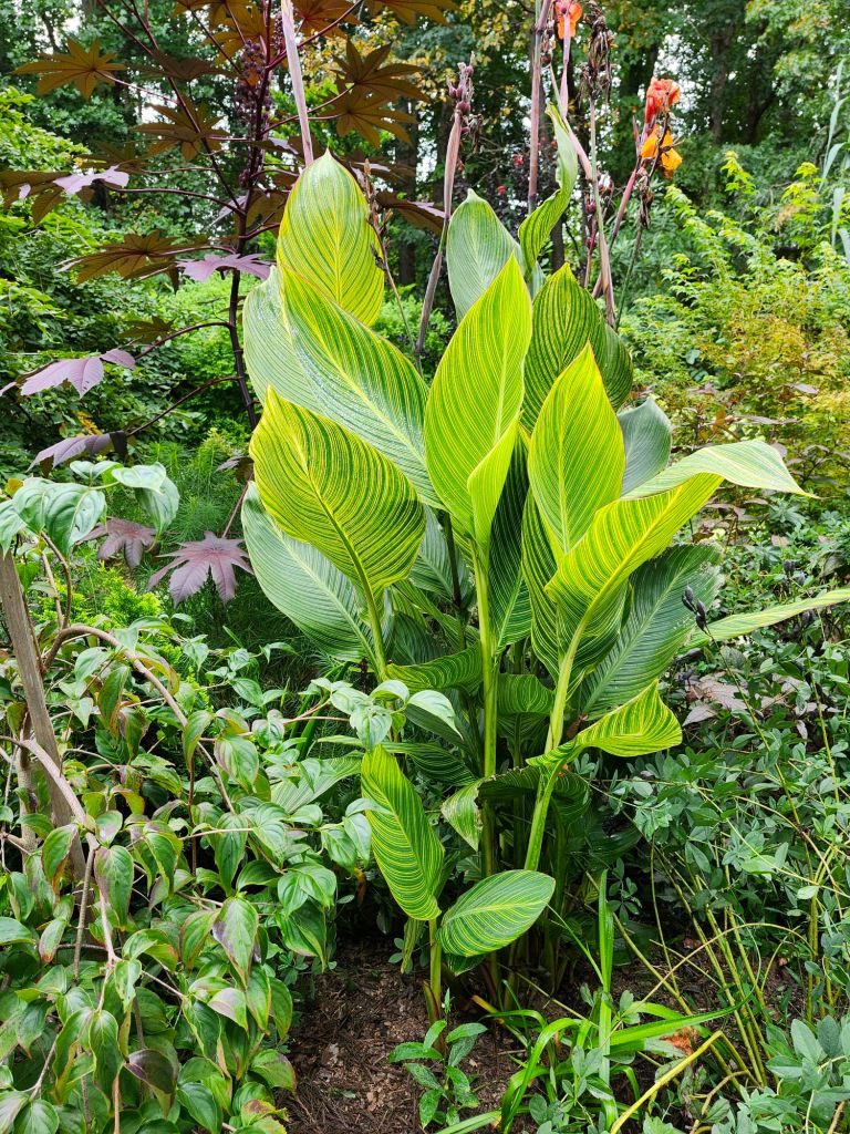 Vigorous amsonia and baptisia have quickly filled in to the point that they are almost too much. A striped Bengal Tiger canna (‘Pretoria’, below) was planted as a filler and left in the ground, expecting it to perish last winter.