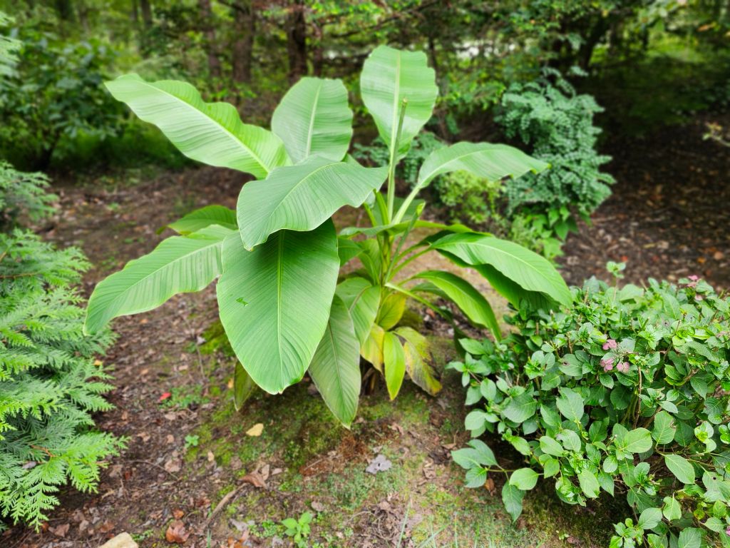 The Basjoo banana has been a slight disappointment. In its second year, it has grown only to four feet tall, almost certainly because it’s too shaded. I hoped the sheltered area would protect its leaves from damage, and this has worked, but it also stunts its growth. Maybe it will grow taller next year. The banana works where it is, but it will complete the jungle effect if it grows to eight feet.
