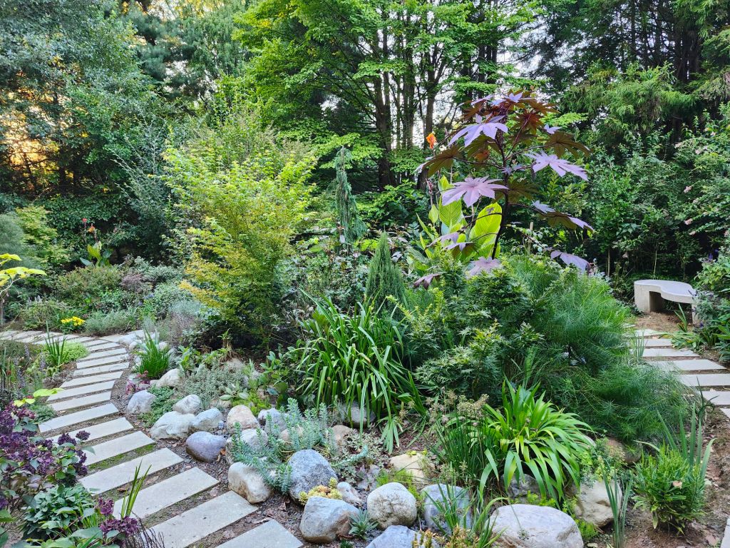 The two year old revision of the lower rear garden that replaced a damp, weedy lawn is coming along nicely. At the start, several fillers were planted so I would not cringe for several years waiting for all to grow up.