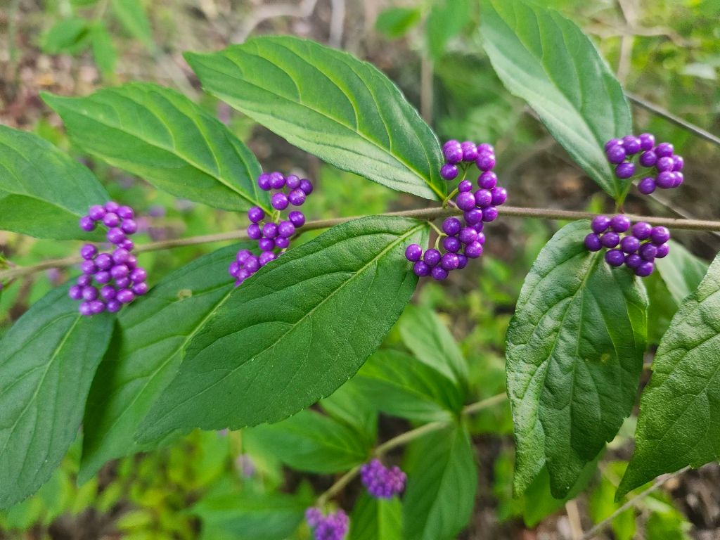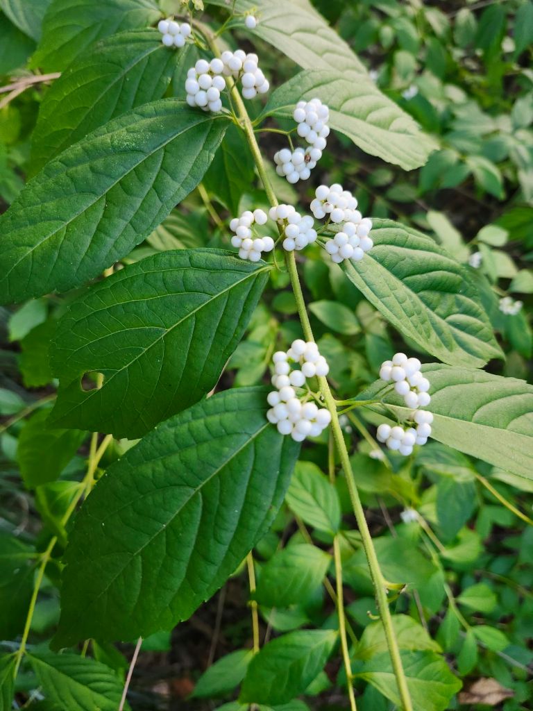 Unfortunately, the lone American beautyberry (Callicarpa americana) perished last winter, and I haven’t a clue why. I suppose it must be as sturdy as other beautyberries that thrive in deep shade and part sun. I will try again, but I see handfuls of seedlings of Asian beautyberries (above and below) in unmanaged areas at the back corner of the garden. These are equally divided into purple or white berries, while other seedlings are a year from flowering. Several will be dug and shared.