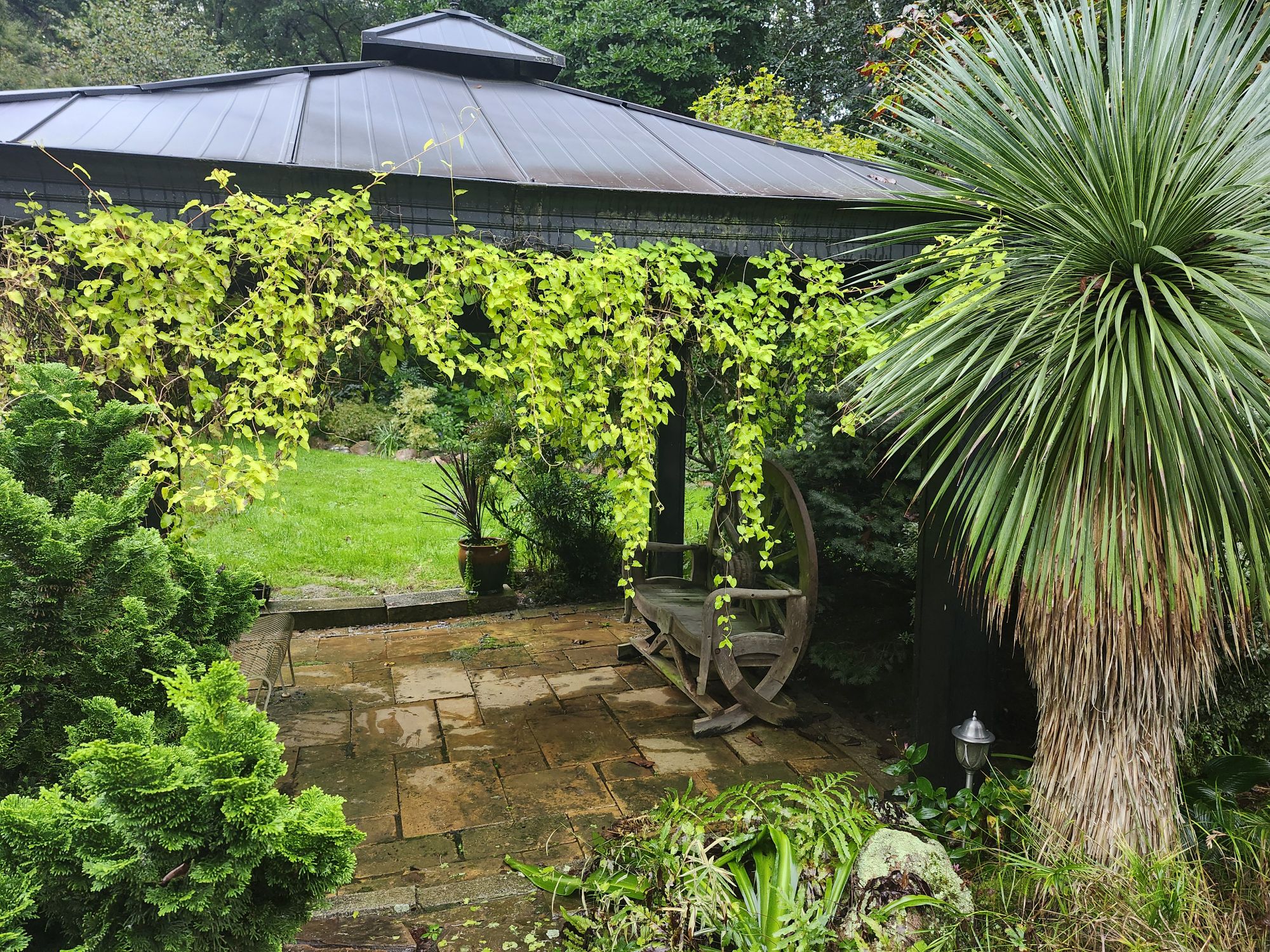 The yellow leafed Chinese fleece vine (Fallopia baldschuanica ‘Lemon Lace’, above) requires regular trimming to allow entrance to the koi pond patio (below). The vigorous vine drapes from wire supports on two sides of the summerhouse, and besides clipping an opening onto the patio, I also snip any stems that veer into neighboring evergreens. While fleece vines are notorious for their rapid growth, the yellow leafed version must be considerably slower since I prune only occasionally. Believe it or not, given my often impulsive plant selection, this was planned, and despite my preference for the least possible labor, the fleece vine has clothed the bare structure splendidly.