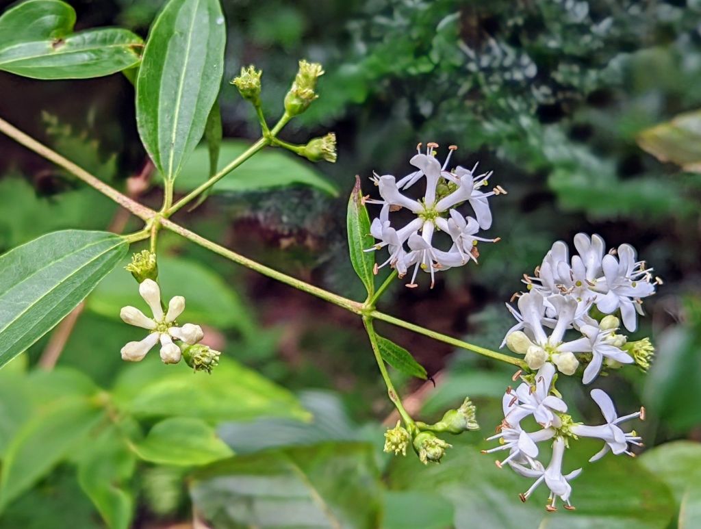 The Seven Son tree (Heptacodium miconioides ‘Temple of Bloom’, above) has passed from its mid summer white flowers (below) to pink calyces that persist until frost. Two small trees planted in autumn two years ago have grown to eight feet, enough to question if this selection is more compact in growth than the species. No matter, I’m happy to have it back in the garden after another was lost to storm damage several years ago.