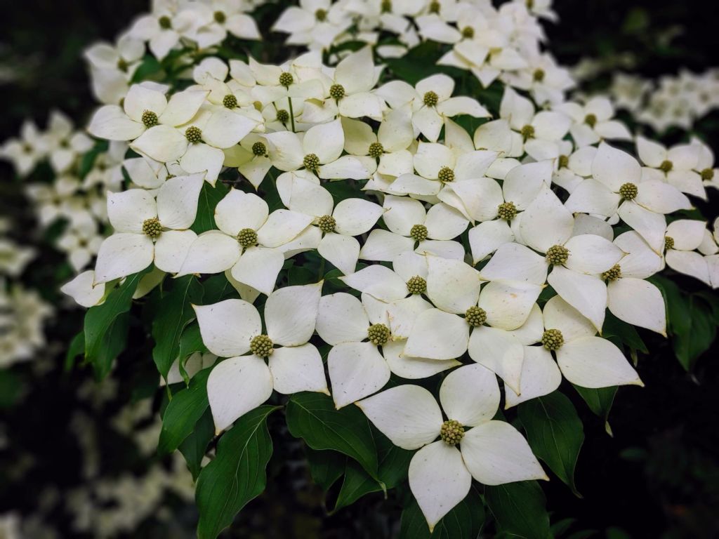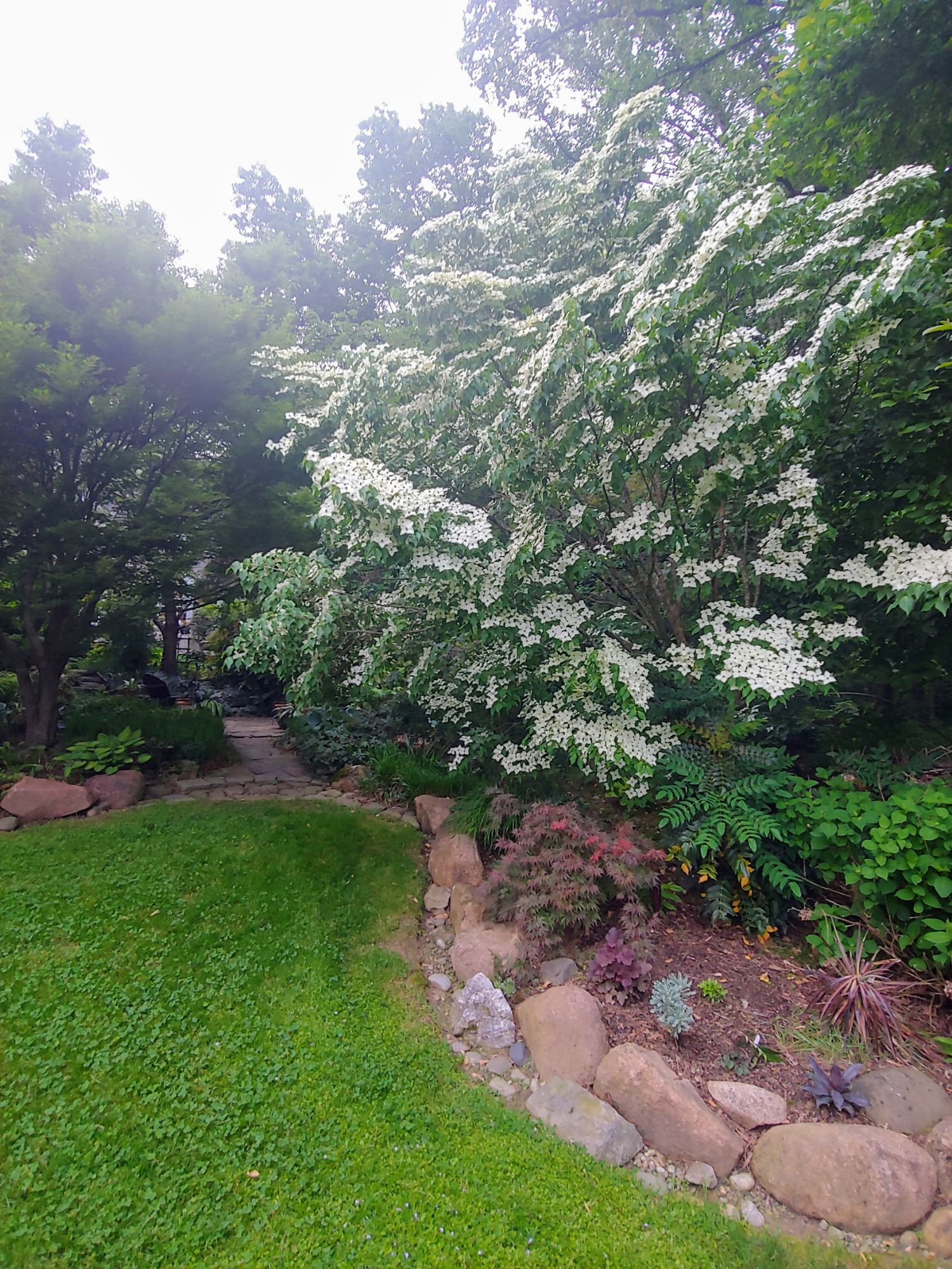 One of the handful of Chinese dogwoods (and many more natives) in the garden. This wide spreading tree is covered in blooms in late May.