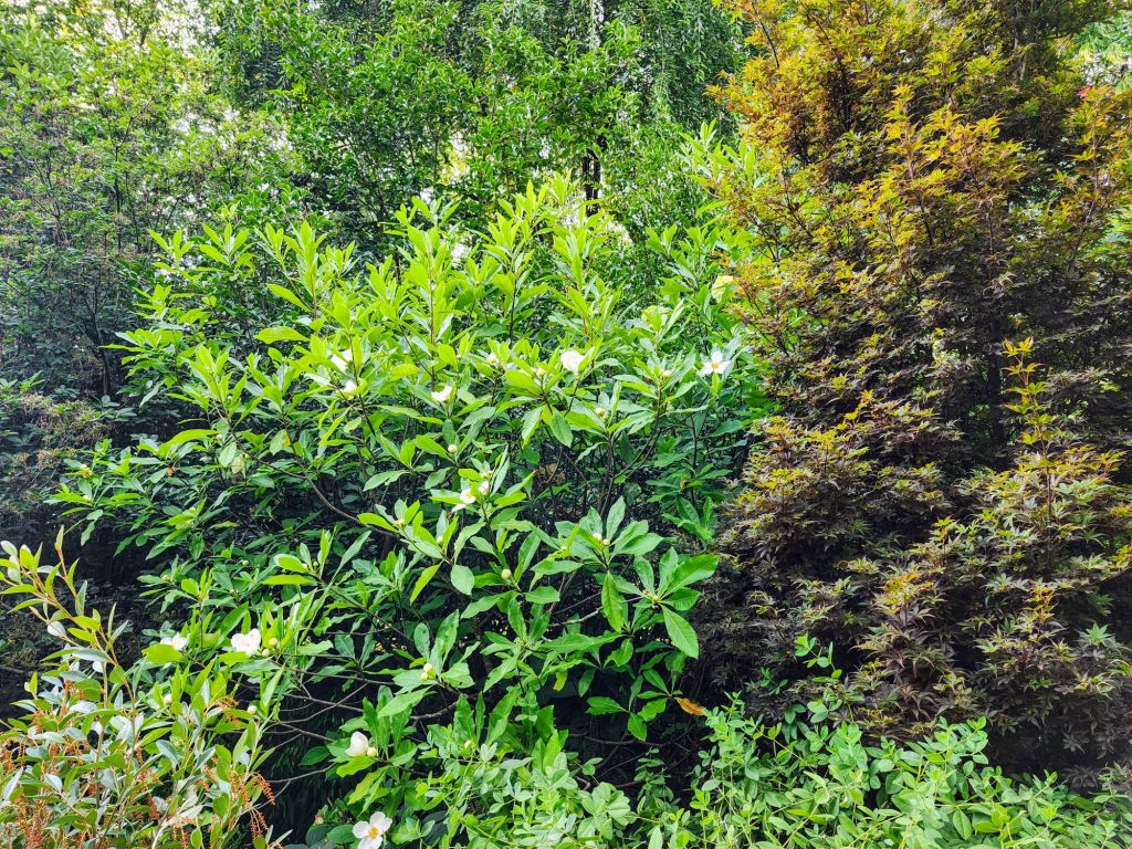 The late summer flowering Gordlinia stands beside a columnar Twombly’s Red Sentinel’ Japanese maple and in front of tall, deciduous azaleas and dozens of various trees.