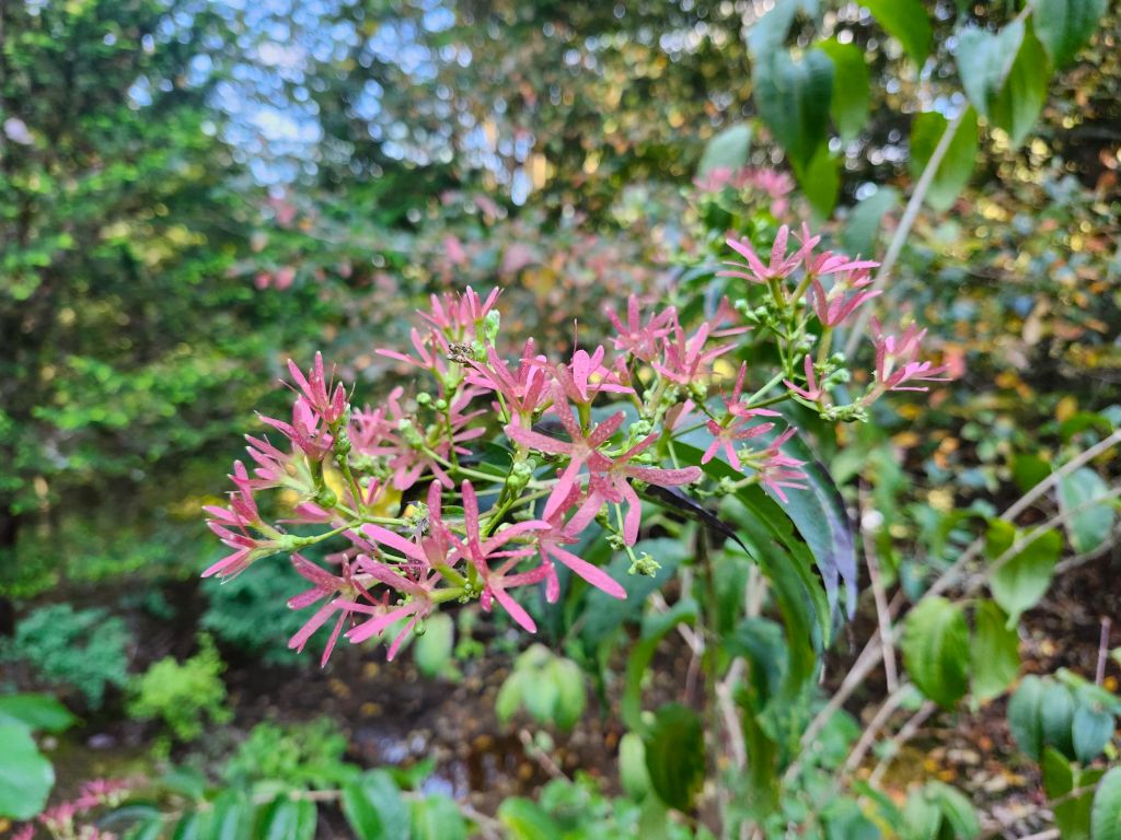 In case you missed it, I must again show the red-pink calyces of the Seven Son tree (Heptacodium miconioides, below). These closely follow clusters of small white flowers that are favored by bumblebees. This color will remain until frost, so the Seven Son provides its colorful display from August into October.