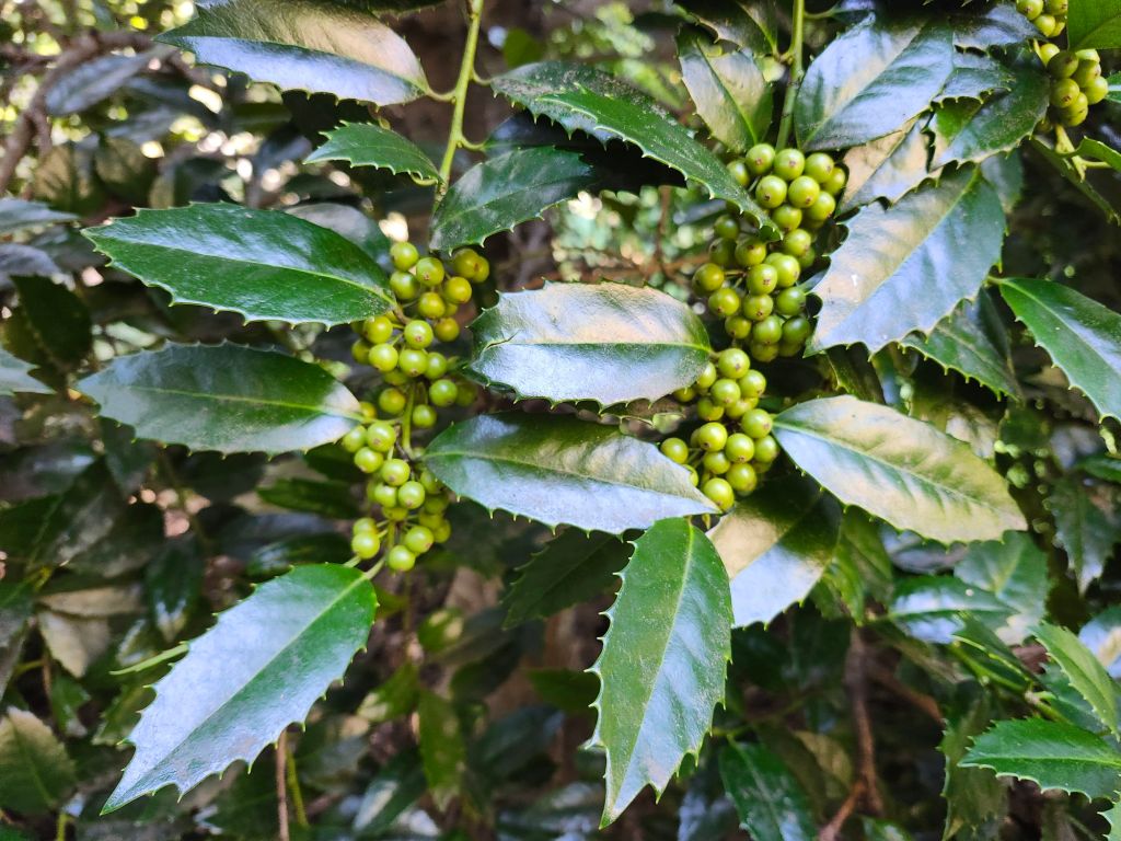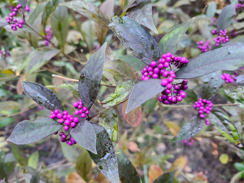 A year ago, a number of the garden’s hollies lacked their typical profusion of berries (above). Evidently, bees were asleep on the job that spring, but they fulfilled their duties this year, and berries are plentiful, not only on hollies but on beautyberries (Callicarpa, below).