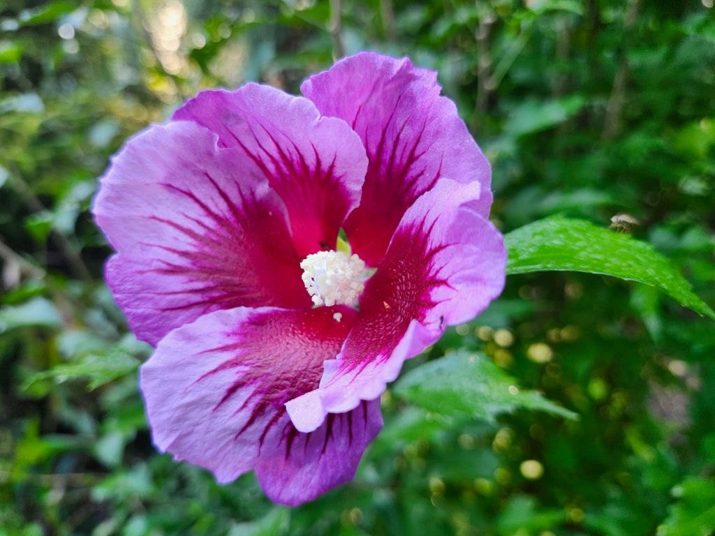 Years ago, a pesky Rose of Sharon spread seedlings along the garden’s western border. Thankfully, this stopped as the tree canopy spread, and of course, I’ve been reluctant to plant another. But, as I look to cram more into the garden, a winter damaged and discounted ‘Purple Pillar’ (Hibiscus syriacus, below) caught my eye. Predictably, the columnar shrub has quickly grown beyond the freeze damaged stems, and in October, it displays the last of its months long flowering.