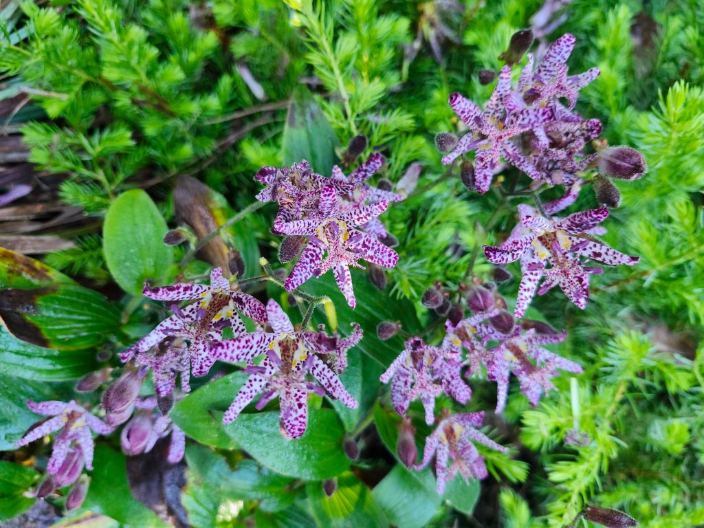The last of the garden’s many toad lilies ( Tricyrtis, below) are flowering, with several that I neglectfully allowed to be overwhelmed by neighbors now poking their flowers through. Much of the garden’s flowering will cease the morning after a frost that could come quickly in October or possibly hold until November, as has happened in recent years. Scattered flowers will continue through the winter months, but falling leaves on this breezy autumn afternoon remind me that it will be months until the garden’s peak flowering returns.