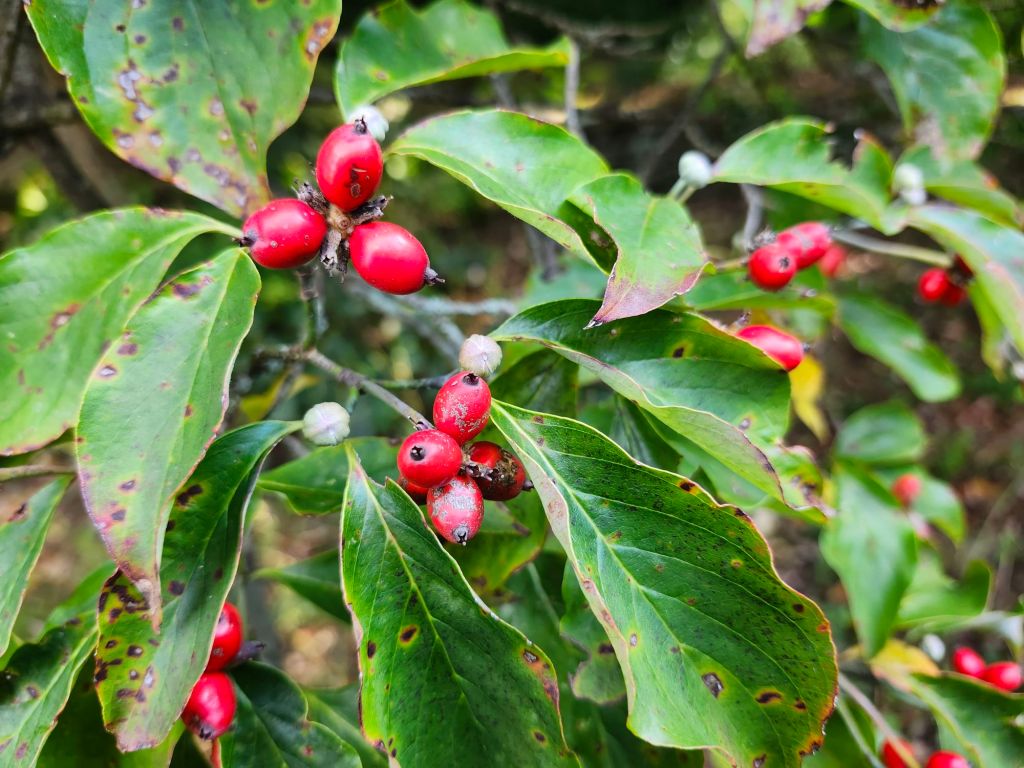 Japanese maples are often the latest of the garden’s trees to display their glorious autumn foliage colors. Dogwoods are among the earliest, but there’s little leaf color this first week of October except drought induced yellows. Still, there’s lots of color.