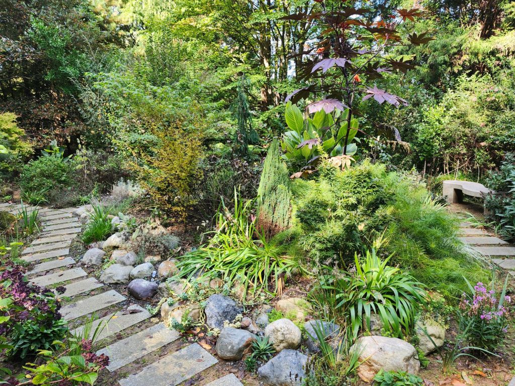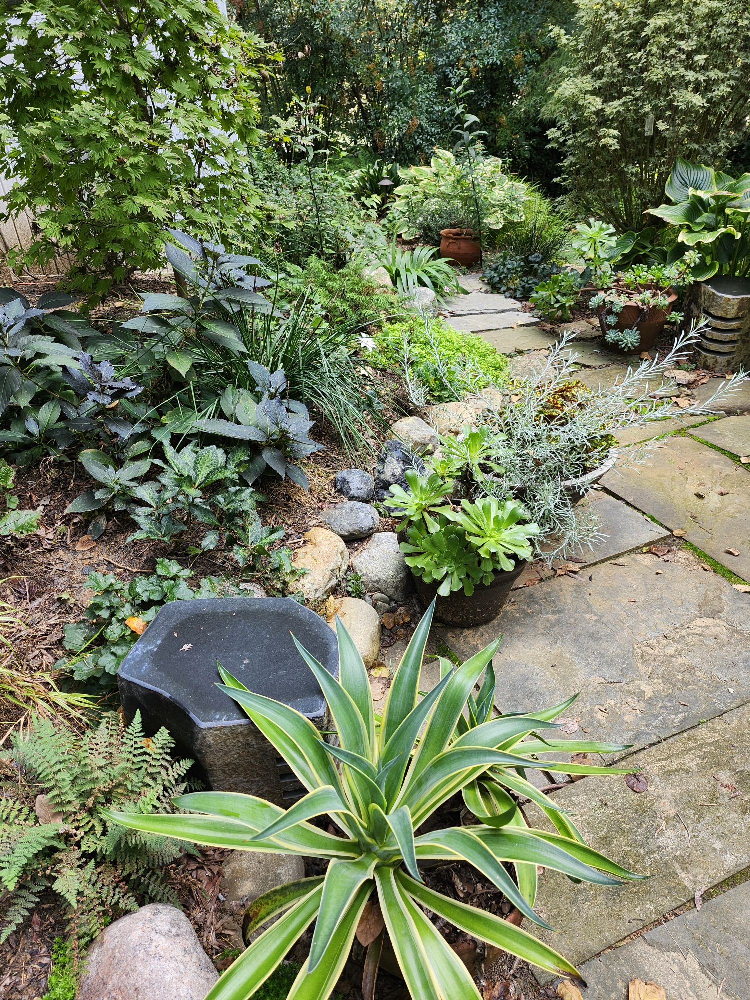 The circular patio now has space for a potted agave and aeoniums (that have recently been lugged to the basement for the winter) and a few containers of colorful begonias. A sturdy stone bench has replaced two rickety wooden chairs, one that was discarded while the other was moved to the lower patio while it continues its slow decay.