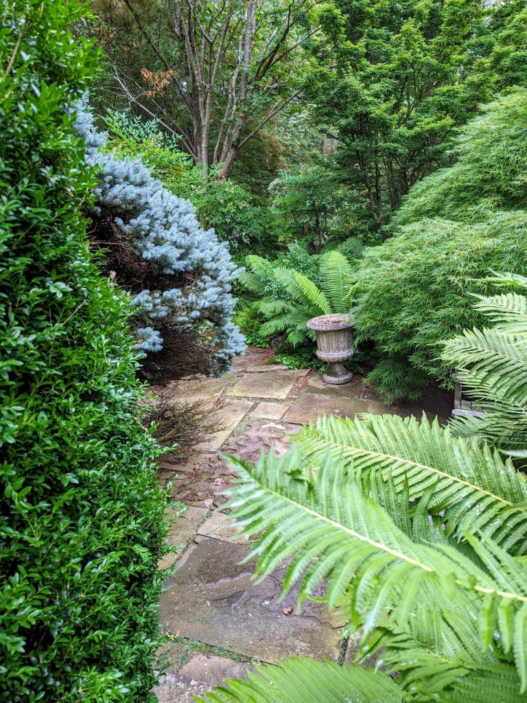 I am quite pleased with the renovation of the overgrown section of garden that was dug out for construction of the sunroom a year ago (above). I excused the overgrown spruce and ferns for too long, and if not for the construction, the upper patio would still be diminished to hardly more than a pathway.