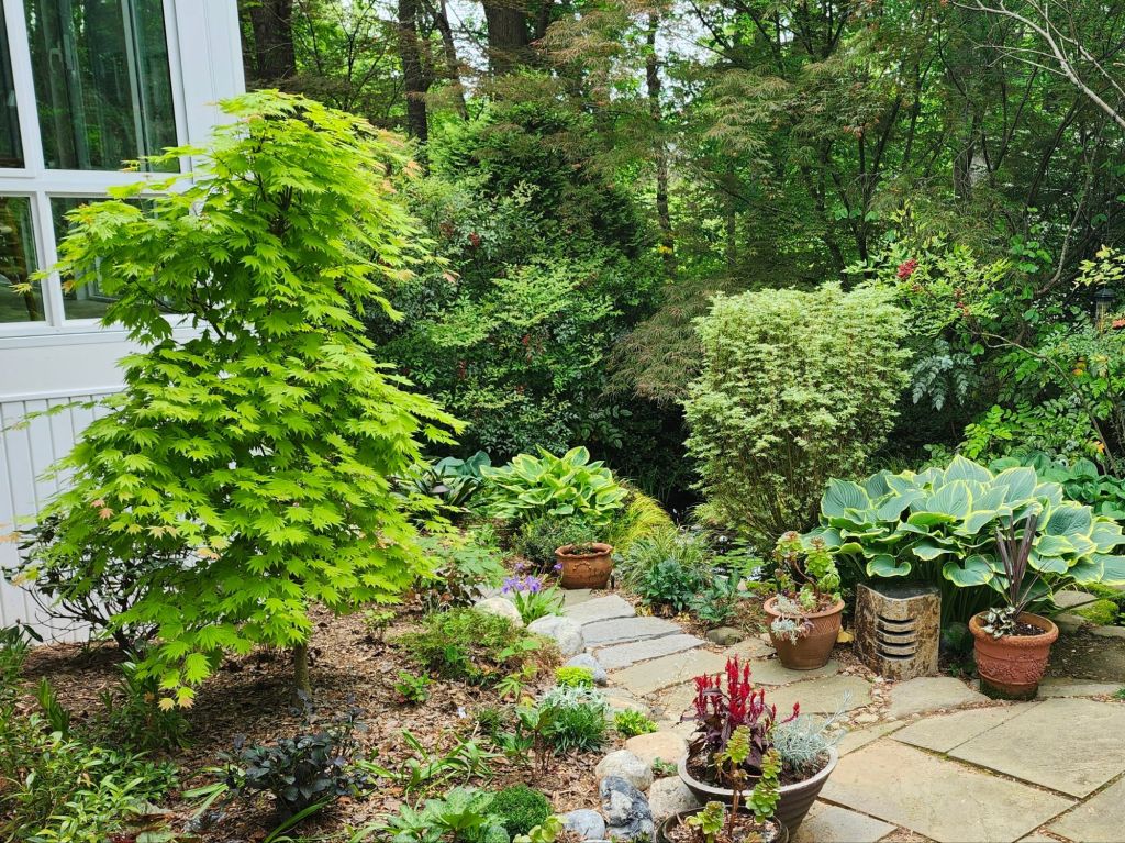 The huge globose spruce has not been missed for a moment. Its removal made room for the yellow leafed ‘Moonrise’ Japanese maple (Acer shirasawanum ‘Moonrise’, below) that I’d been looking to shoehorn into some space that would be barely appropriate, but now it has adequate room to grow for years. The maple has grown more than expected for a first year tree. Already, Barbara is concerned that it will quickly overgrow the area.