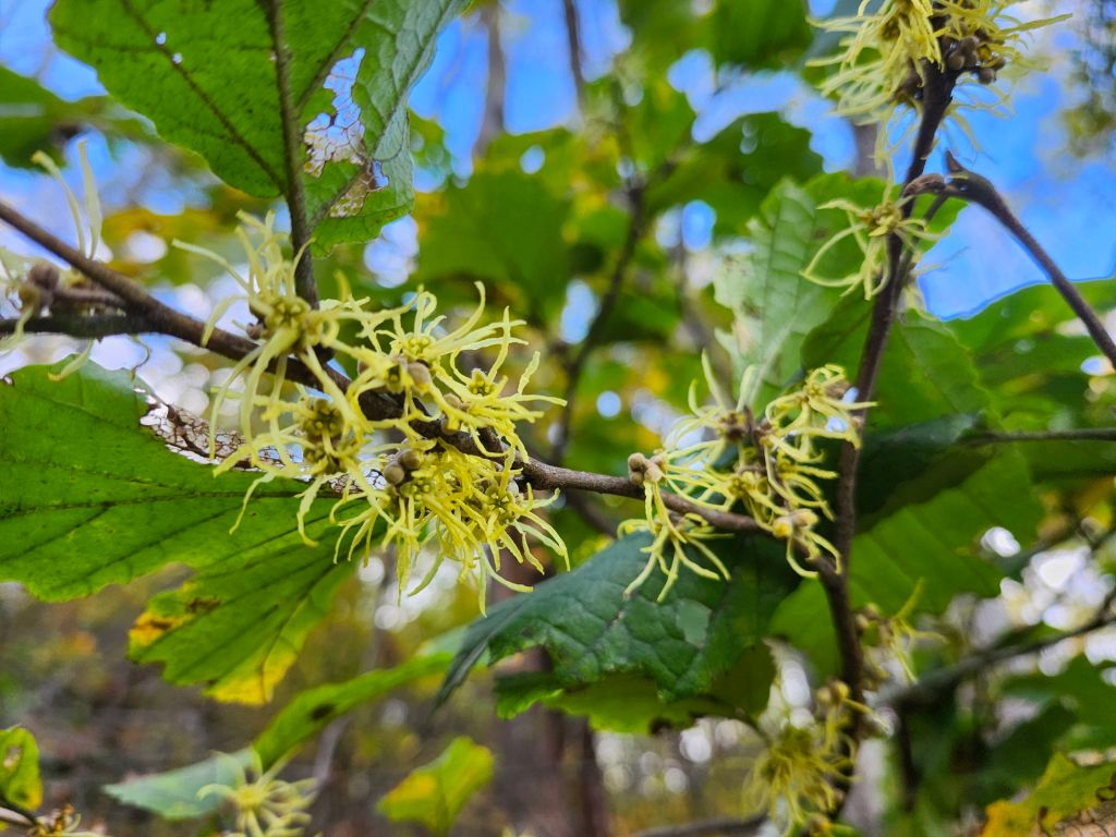The native, common witch hazel flowers in October, often with leaves partially obscuring the blooms.
