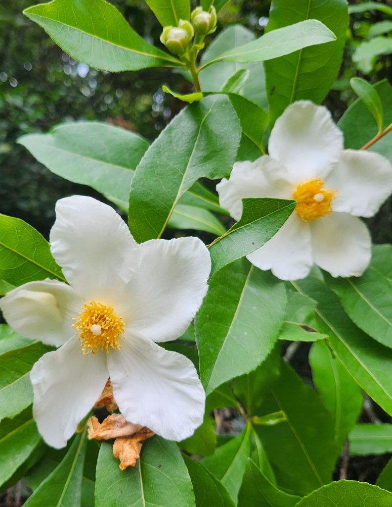 To the rear of the grevillea and schefflera, gordlinia (x Gordlinia grandiflora, above) begins flowering in July with stragglers into September. So, two flowers late into October were a surprise. I was occasionally delighted when a flower of the related Franklinia (sadly, lost several years ago) would persist until its foliage began to turn in autumn, and while leaves of gordlinia do not turn until later in autumn, the late flowers recalled this favorite tree.