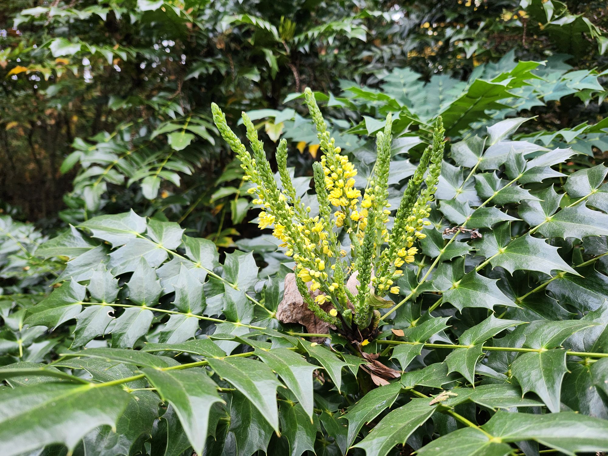 In any case, ‘Marvel’ is a few days from flowering, but a week behind other autumn flowering mahonias with blooms that often persist into January (Mahonia x media ‘Winter Sun’, above). I planted two ‘Marvel’ (to join a handful of various mahonias) a few years ago, and this will be the first significant flowering for both while flowers of other mahonias are a highlight of the garden. I have seen no seedlings from the hybrid mahonias and only a few from the leatherleaf mahonia (Mahonia bealei, reputed as invasive) in its decades in the garden.