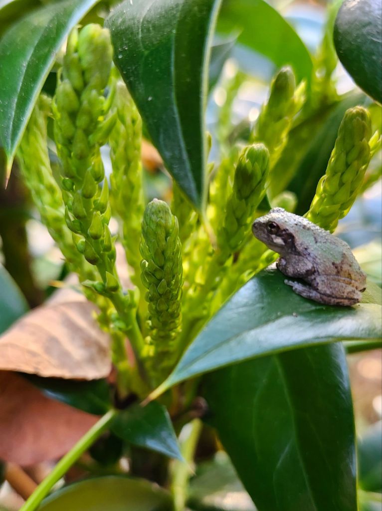 As I checked the swelling buds of ‘Marvel’ mahonia (Mahonia x media ‘Marvel’, now Berberis x hortensis, above), I noticed a creature perched near the buds at the top of the evergreen shrub. It hopped to a second leaf before I recognized the frog in this odd location. Sorry, there’s no food up here, but you’re safe from me accidentally stomping on you.