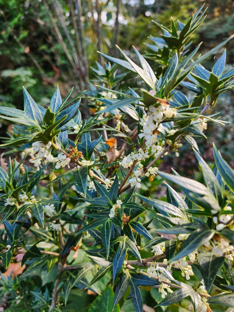 Near the ‘Marvel’ in the lower rear garden, the dangerous looking ‘Sasaba’ osmanthus Osmanthus heterophyllus ‘Sasaba’, above) is covered in tiny, fragrant white flowers. Unfortunately, I can’t smell it (or anything else), but the blooms are welcomed at a time when flowers are fading. Other osmanthus in the garden display fewer blooms, but still, it is the sharply pointed leaf of ‘Sasaba’ that is most notable.