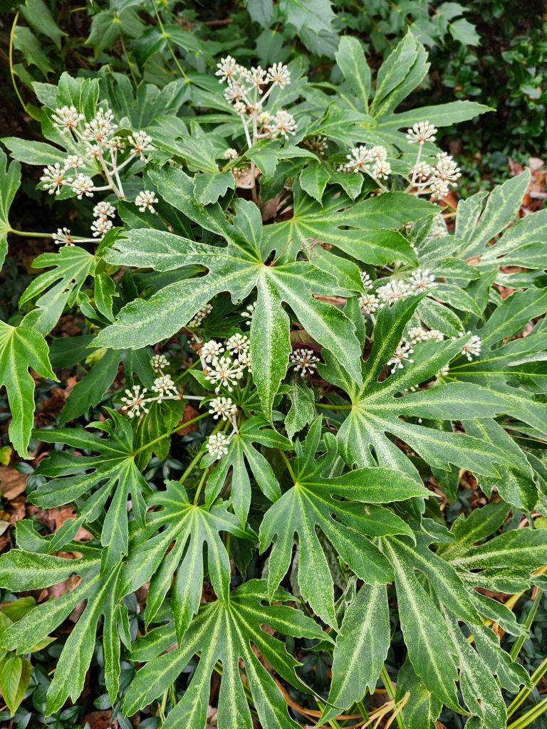 While flowers of ‘Spider’s Web’ fatsia (Fatsia japonica ‘Spider’s Web’, below) are past their peak, the pollinated blooms continue to stand out. It is unlikely that fruit and seed will develop in our cold temperatures, but I could be surprised.