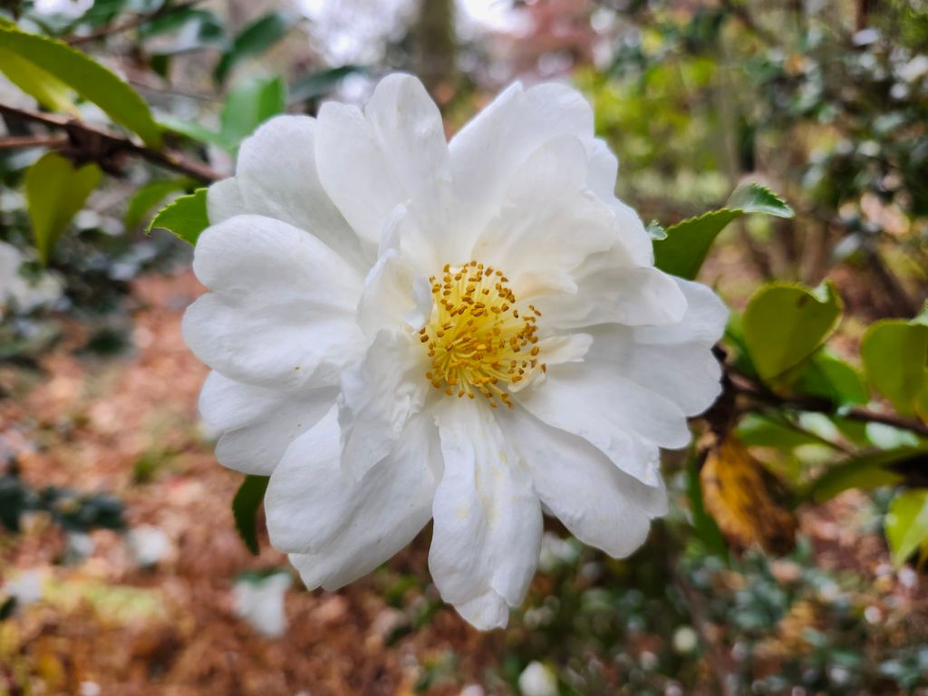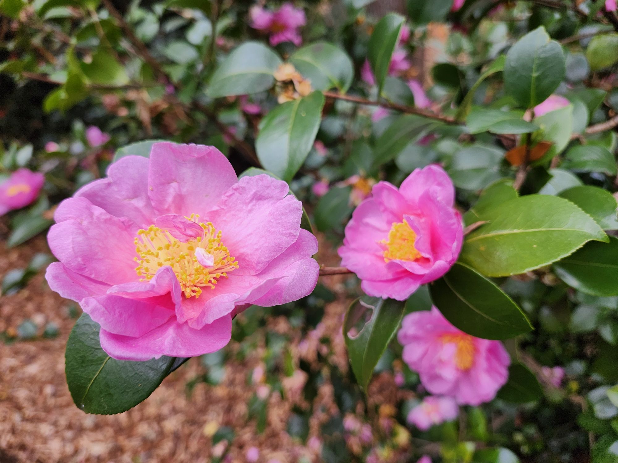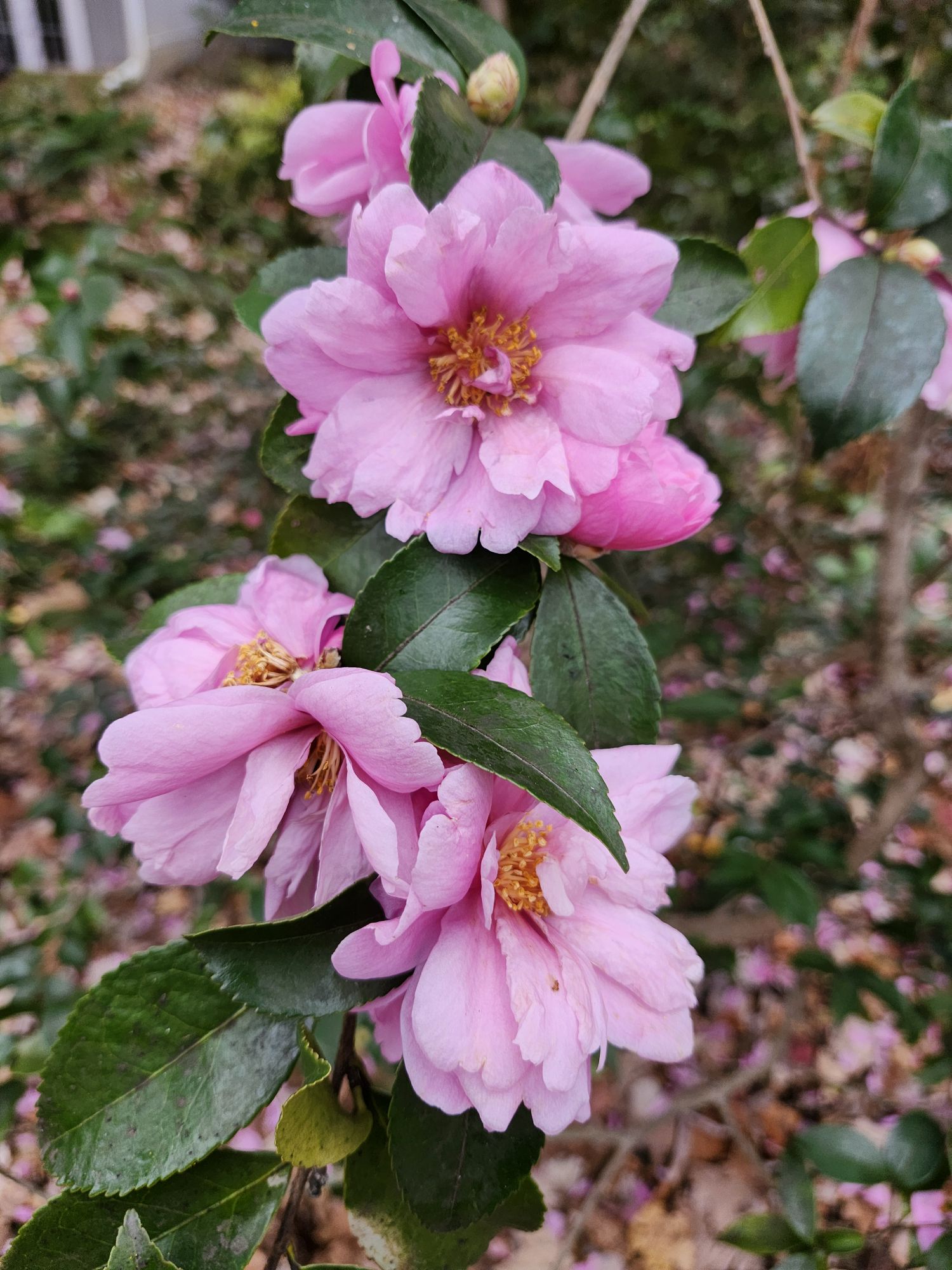 Flowers of the sasanqua and hybrid camellias (above and below) continue their autumn cycle through the cold with flowers damaged by temperatures in the low twenties. Flowering should continue for several weeks, and there are occasionally a few stray blooms in spells of mild temperatures into January.