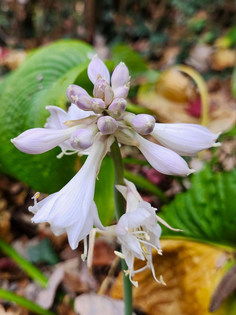 Several green leaves remain on a single hosta, but surprisingly, it also has a long overdue flower. With quirky swings in rainfall (or lack of) and temperature, this autumn has offered one surprise after another. But, I knew I must be mistaken when I first saw the bloom.