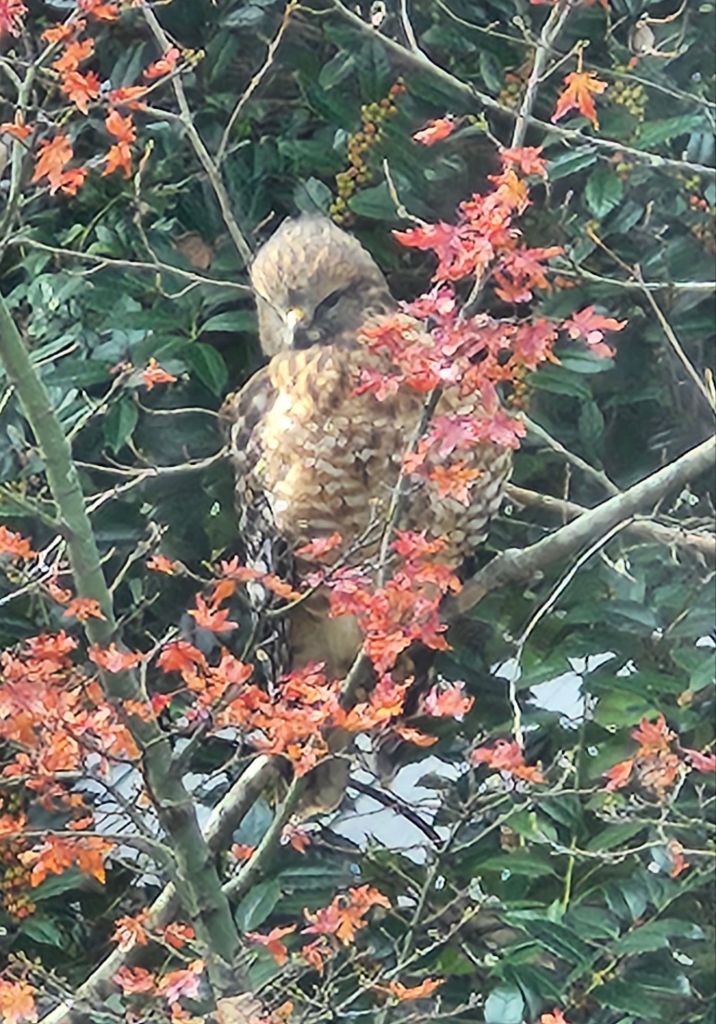 The red shouldered hawk has returned to its regular perch, monitoring activity around the bird feeder just outside the sunroom. Smaller birds are cautious at first, but then resume feeding without fear that the large bird can maneuver through branches. Squirrels are more cautious, but finally, they return to harvest seed that birds have dropped to the ground. Occasionally, the hawk will dive to the small pond between the sunroom and feeder, but whatever prey is protected today by this thin layer of ice.