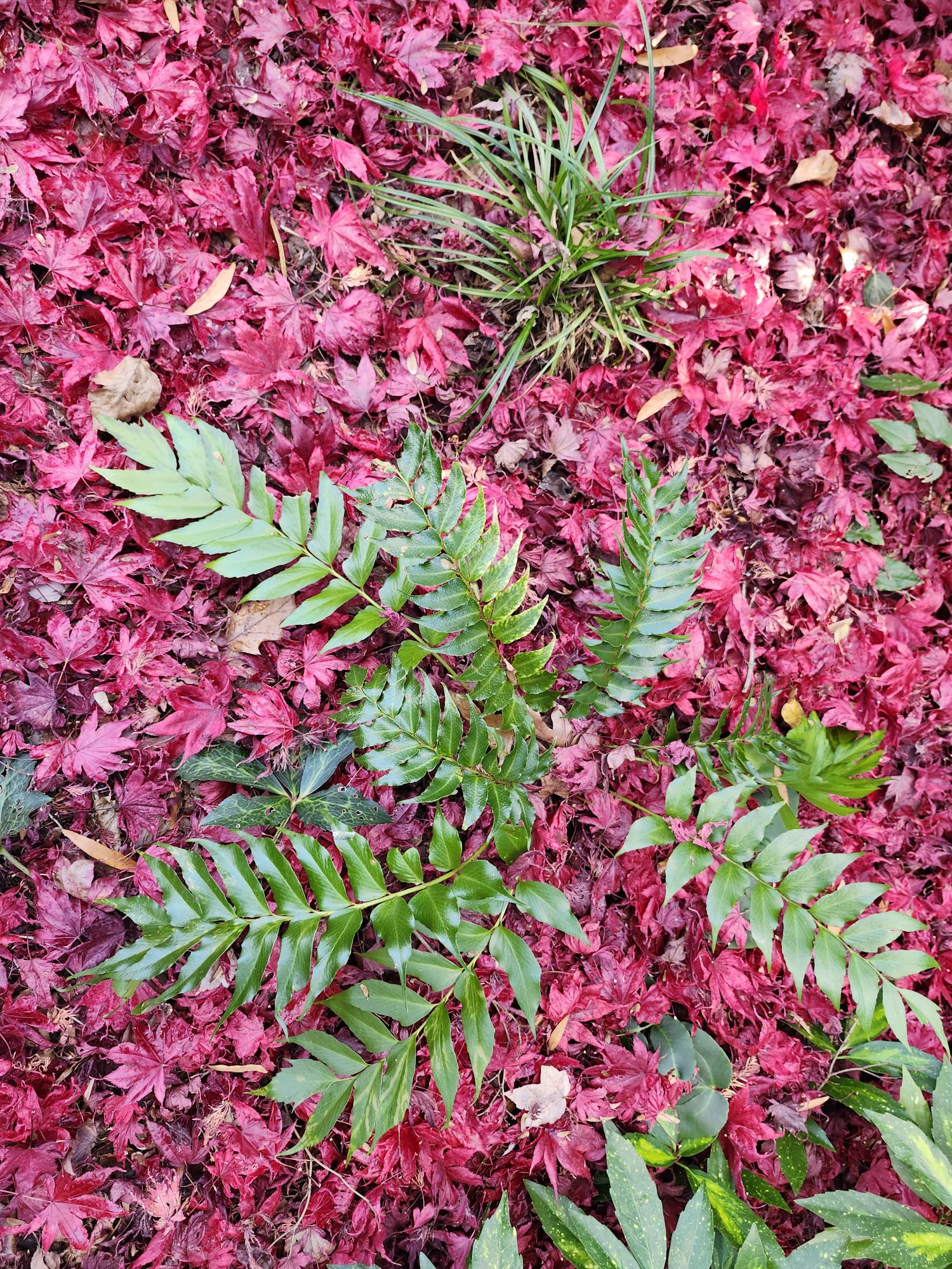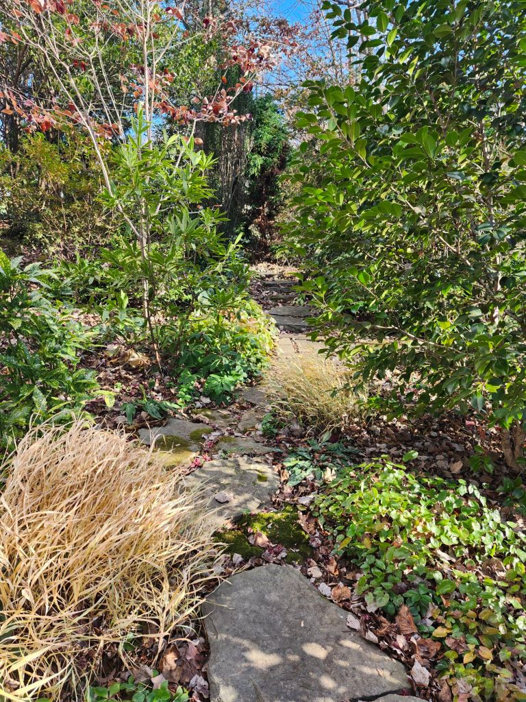 Larger branches, usually from maples and tulip poplars that overhang the side garden, are discarded into piles (above) that could possibly shelter wildlife, though I have yet to witness signs of life. The smallest branches are snapped into pieces and dropped as mulch, falling amongst layers of leaves from the garden’s many trees. While most of the ground covering leaves are brown, for a few more days I’ll enjoy the blanket of red from the ‘Bloodgood’ Japanese maple along the front walk (below).