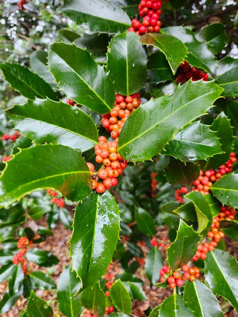 Fragrant red, yellow, and orange flowered azaleas planted nearby have grown to fifteen feet or taller, and for several weeks in spring, this is a highlight of the garden. But, the hankering for hollies remains, and while the clusters of red berries of evergreens are rarely consumed by birds until late in winter, berries of deciduous hollies are often eaten early in the season.