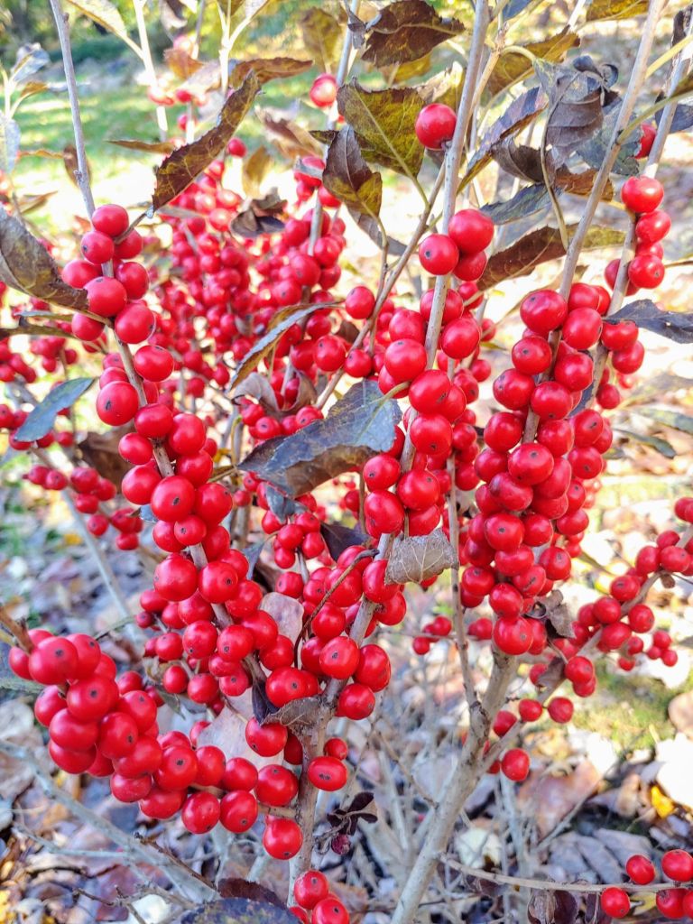 Little must be added to this densely planted garden, but as flowers fade and leaves drop, I often focus on brilliantly colored berries of the various large evergreen hollies (above). I’m reminded of unfulfilled plans in recent years that I must add several native, deciduous ‘Winterberry’ hollies (Ilex verticillata, below) to replace two lost several years ago. The area was replanted with deciduous azaleas that will undoubtedly grow to fill the space and provide splendid color.