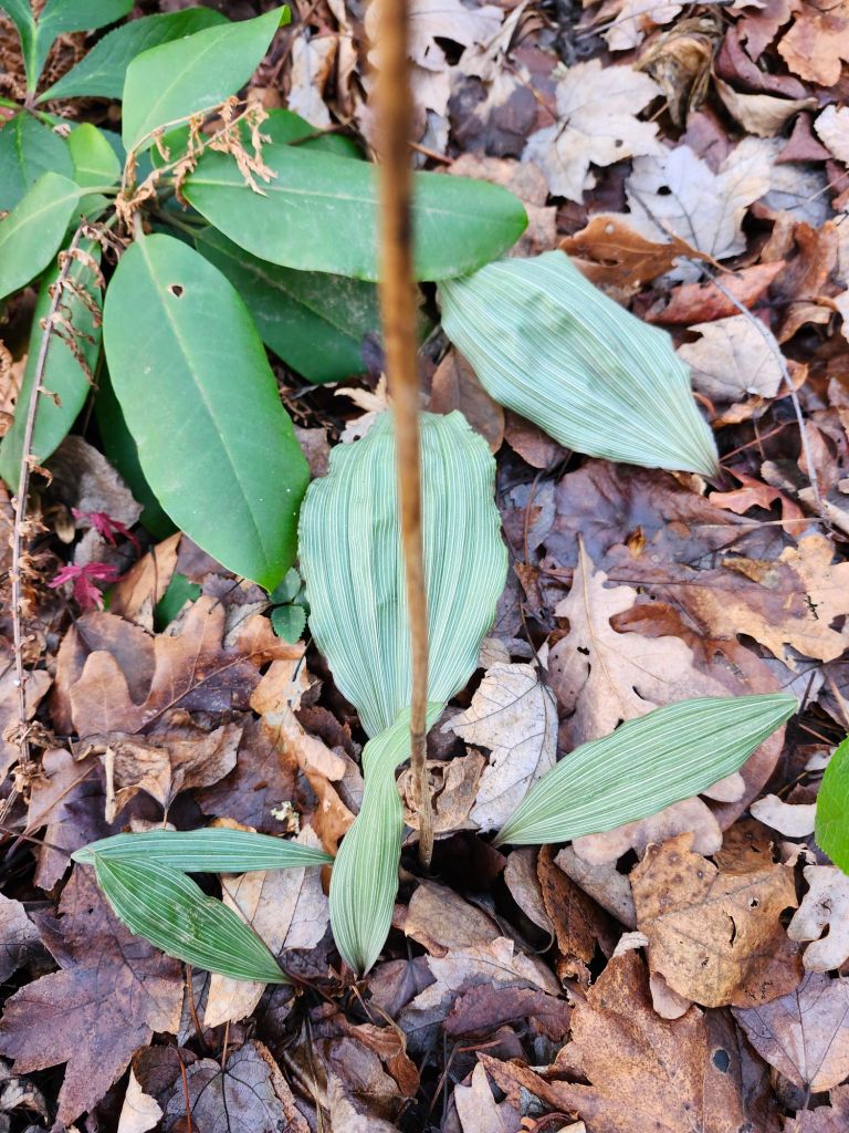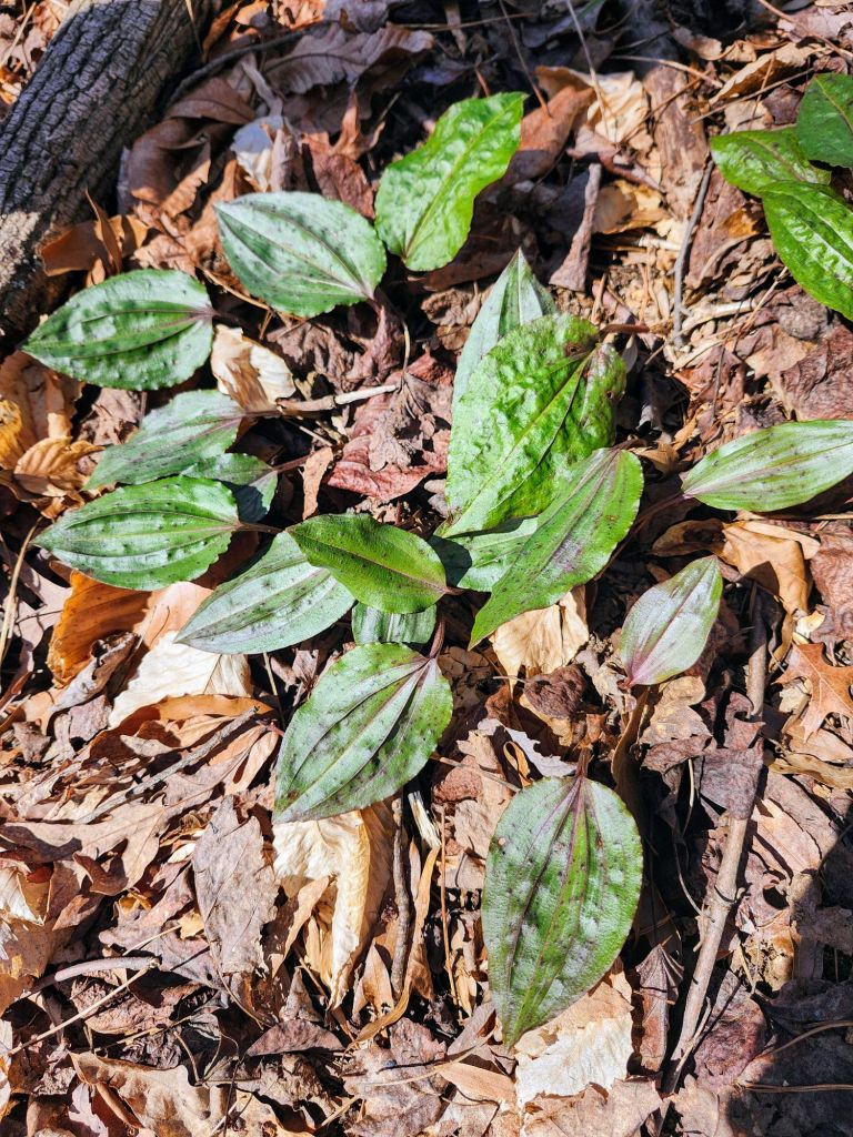 There are now nine putty roots, and like cranefly, the leaf of this native orchid disappears after flowering in late spring. A new leaf appears in late summer, standing nearly straight up so that it stands above the clutter of falling leaves. The leaf persists through the winter as it leans flat to the ground to maximize sun exposure.