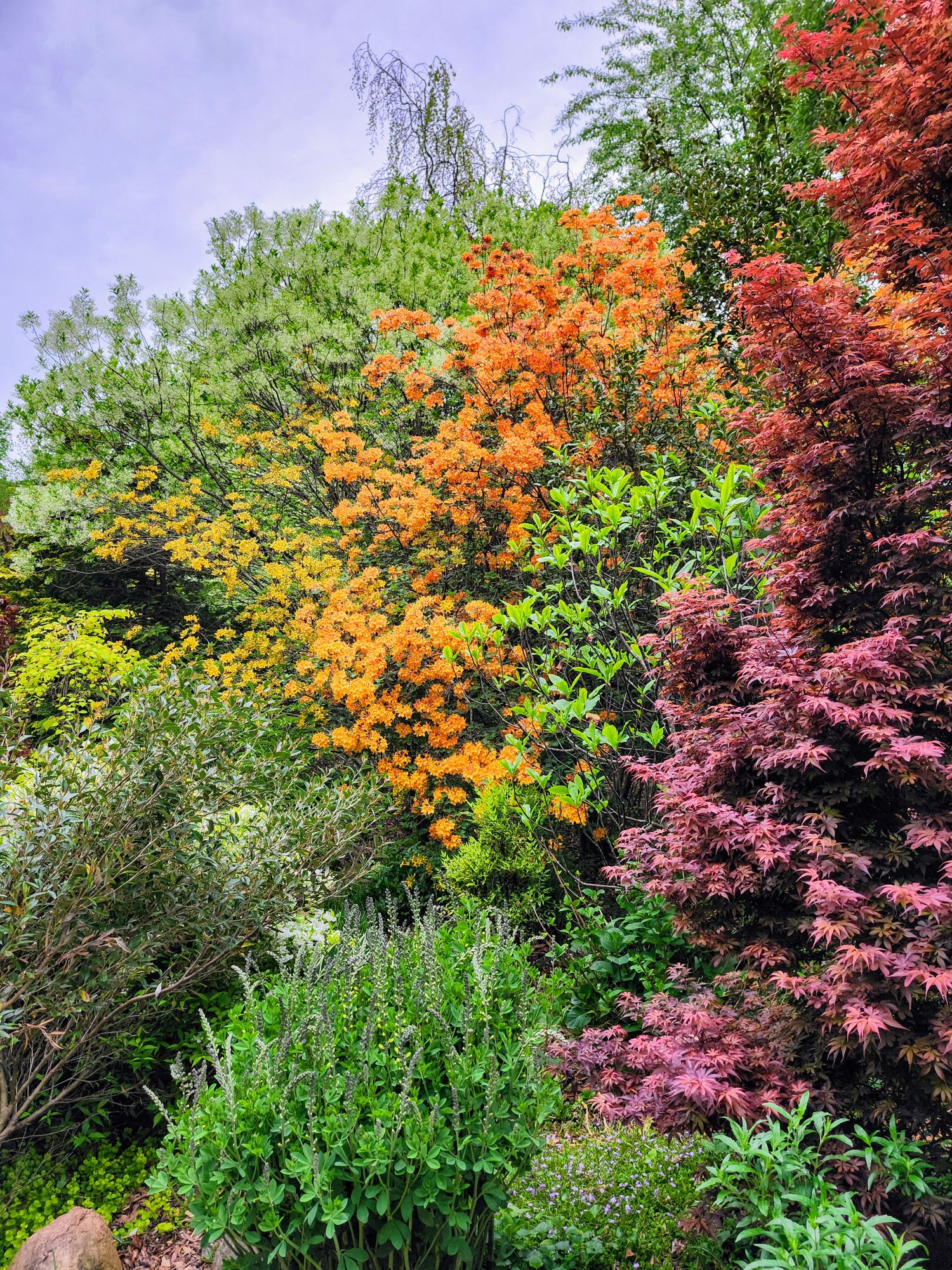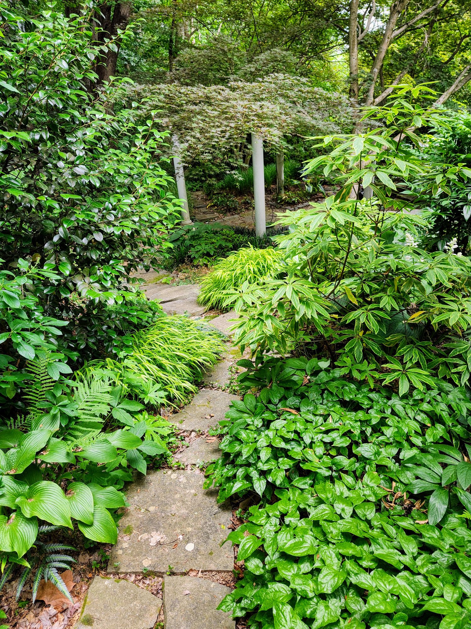 Fringetrees and deciduous azaleas highlight the garden in mid-spring.