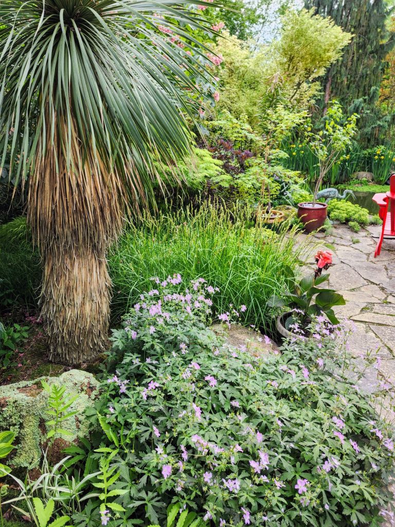 The koi pond patio is bordered by Japanese maples and two tall Yucca rostrata.