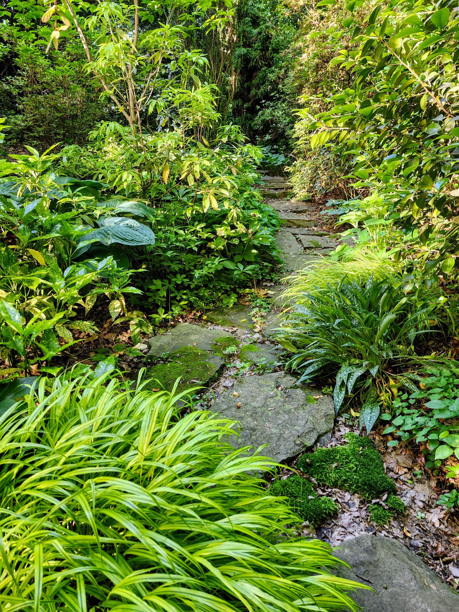 The side garden features more foliage than flowers, though epimediums and camellias flower for weeks in early spring.
