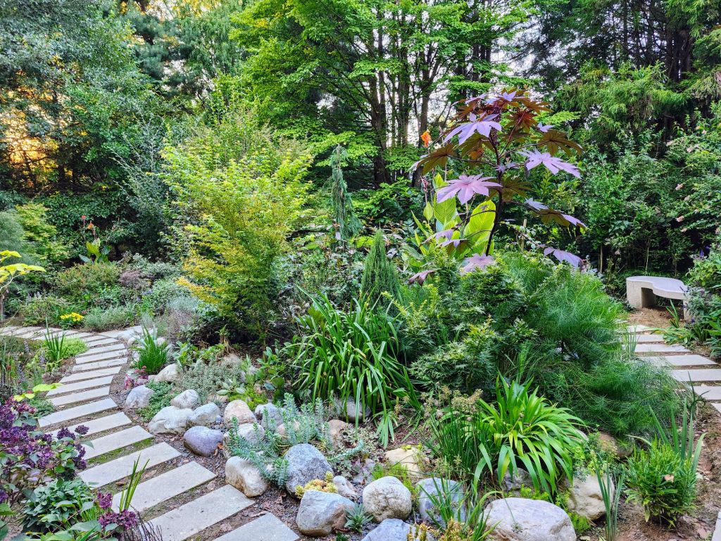 Japanese forest grass (Hakonechloa) is scattered through the shade garden.