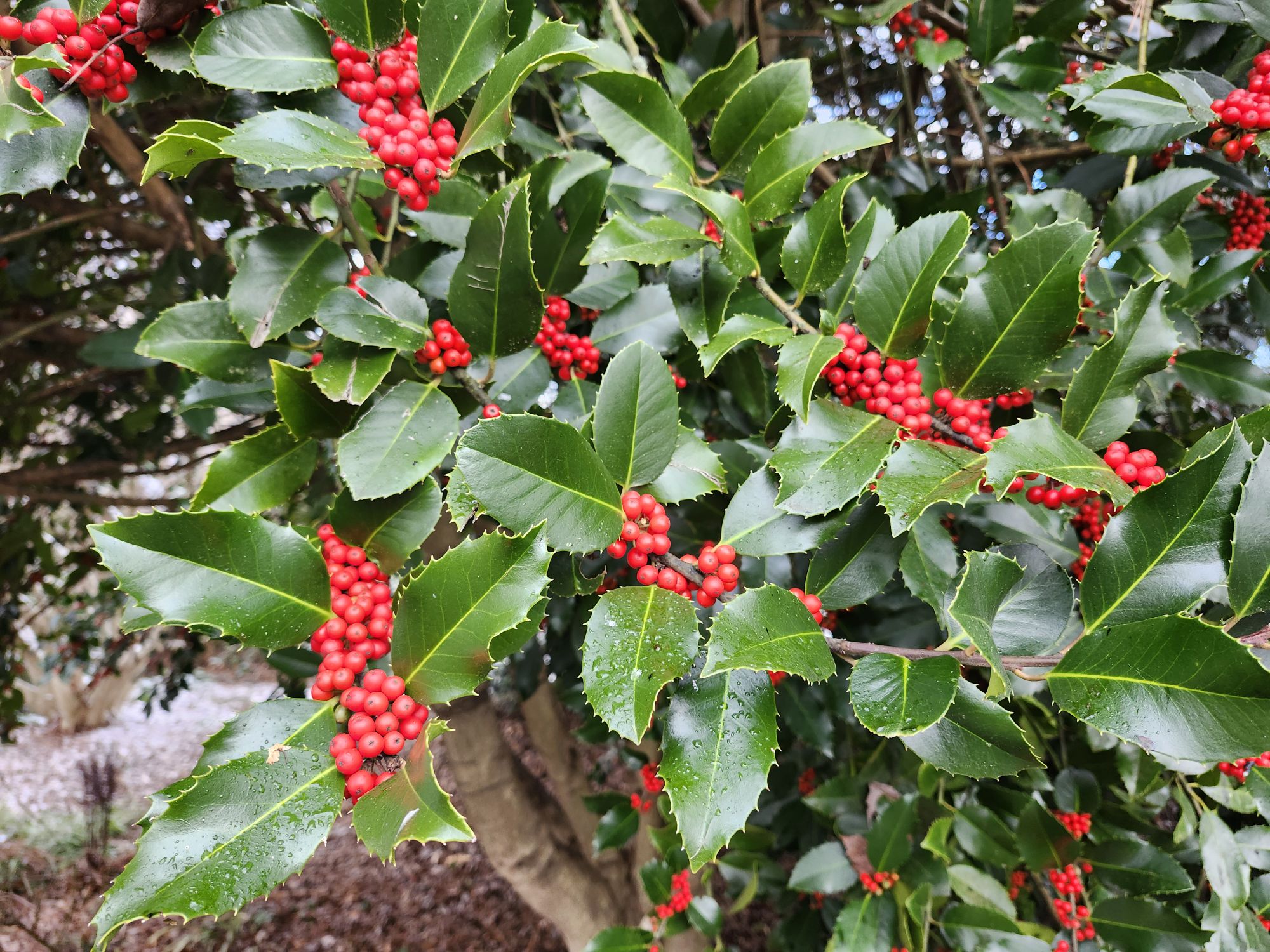 Berries of the Koehne holly (Ilex koehneana, below) litter the driveway, though these hundreds barely dent the holly’s many clusters. The ripe berries have been dislodged by flocks of robins that are not regularly seen in such numbers, but dependably visit this holly and another equally large ‘Mary Nell’ later in winter.