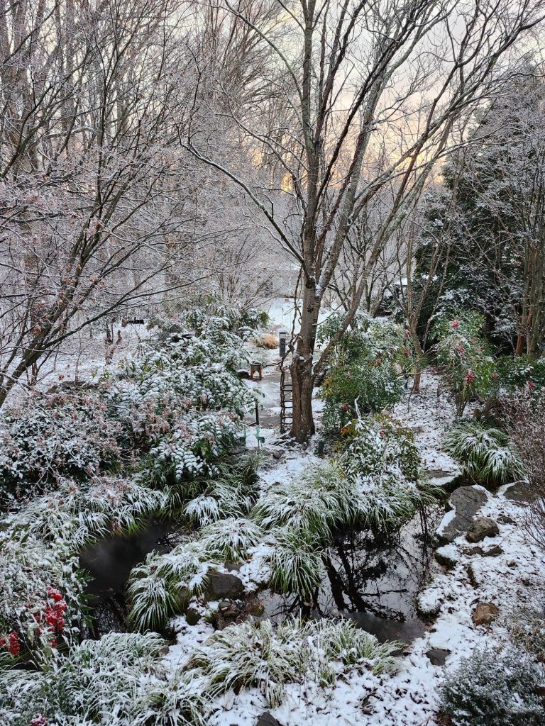 The scene is frenetic, not typical for this tranquil garden, but as a snow squall coats the garden, there is also frenzied competition for sunflower seed at the feeder. As the storm passes and bright sunshine returns, the frenzy slackens.