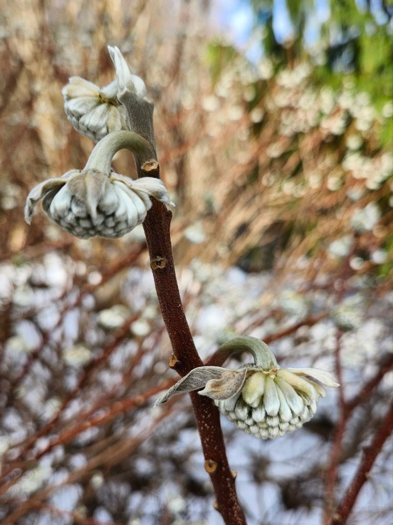 My next concern was the possibility of damage to flowers of paperbushes (Edgeworthia chrysantha, above) with the drop to three degrees. In the past, buds have been ruined at similar temperatures, so I’m overjoyed that no flowers appear to be damaged. While injury to shrubs often can not be seen for weeks, I’ve seen damage to paperbushes’ flower buds appearing immediately.