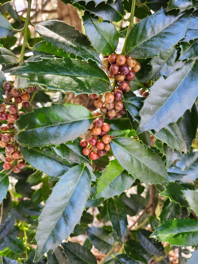 For an hour this morning, dozens of robins would fly to the large holly, grab their fill of berries, then fly in all directions to taller trees in the garden or the nearby forest. This was repeated until they had their fill, and all moved on. I expect the robins will return to feast until the berries have passed their desired ripeness.