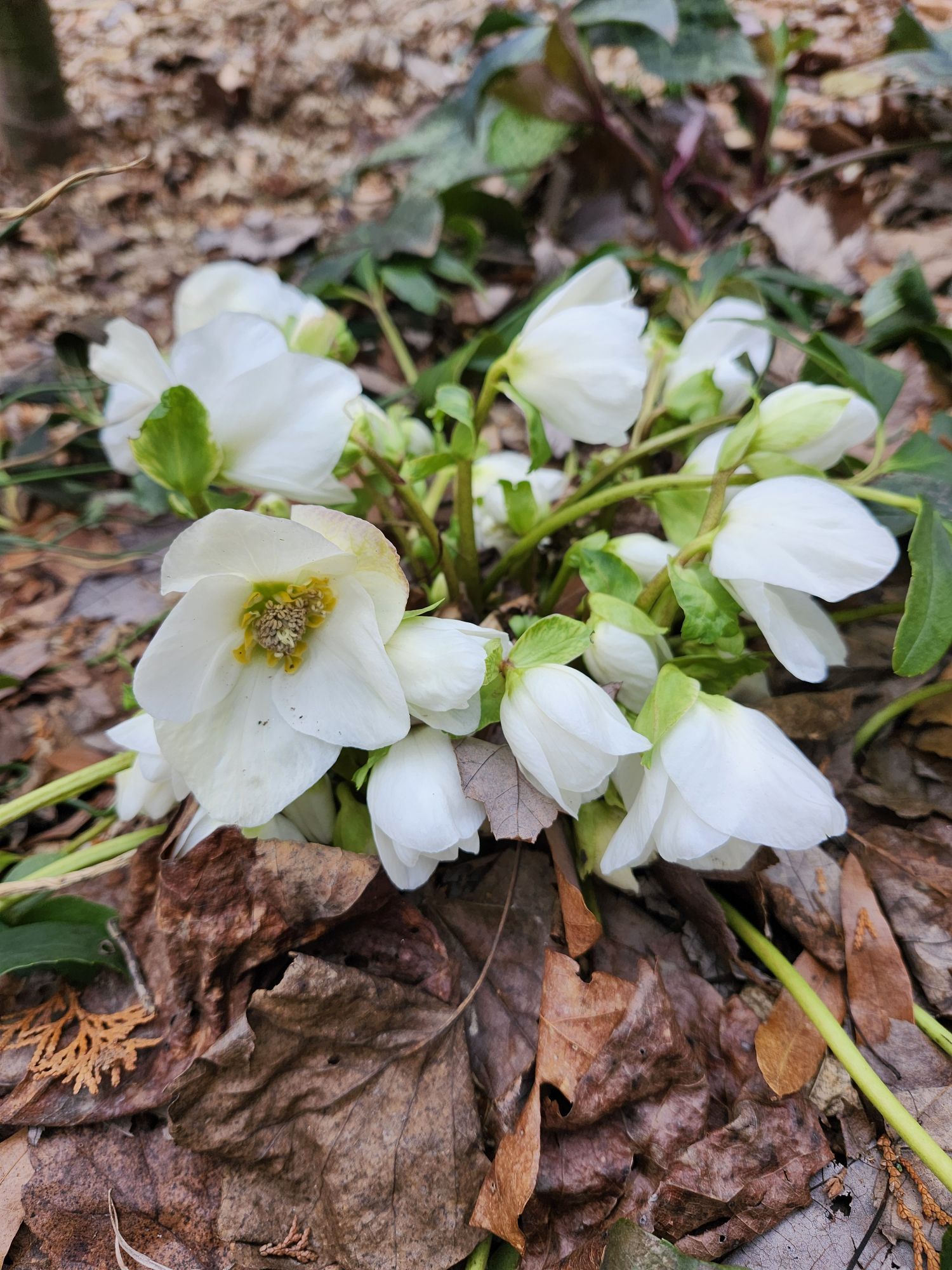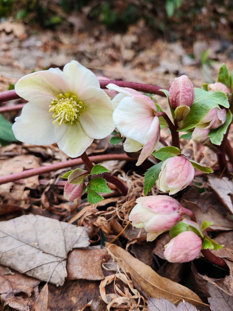 I haven’t a clue how many hellebores are in the garden, but if seedlings are counted, it’s hundreds. Many are too young to flower, but there are more than enough flowering now that the snow has melted with dozens more that will soon begin. One Christmas rose (Helleborus niger, below) did not flower along with others in December, so it popped open hours after emerging from the snow.