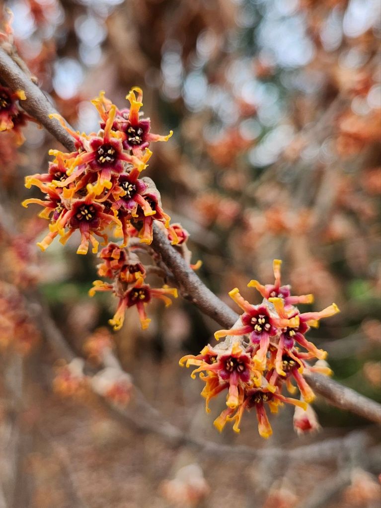 While flowering of the Ozark witch hazels (Hamamelis vernalis, below) began weeks ago, the spidery flowers remained tightly curled for protection from cold temperatures for much of the past month. I expect that none were pollinated during this period, so blooms might stick around a few weeks longer to join Asian hybrids (Hamamelis x intermedia) with buds that are beginning to crack open.