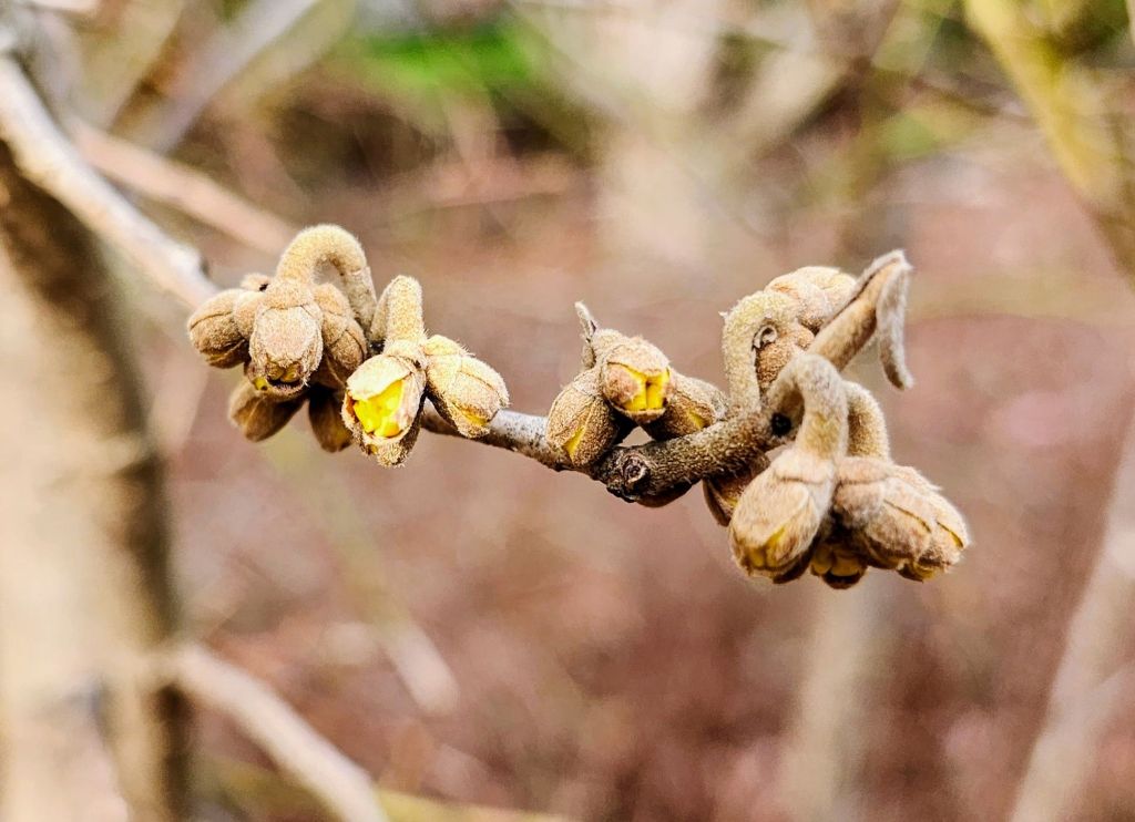 The paperbushes (Edgeworthia chrysantha, above) have flowered in late January in recent mild winters, but typically, the first glimpse of the yellow tipped flowers comes in early February. Perhaps this brief period of warmth will accelerate swelling of buds, but flowering is likely to be delayed by a week or more.
