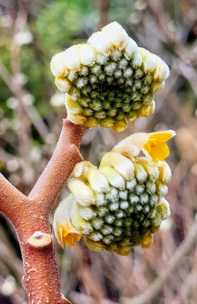 I’m told that the daphne related paperbushes are strongly scented, but in addition to colorblindness, my sense of smell is also deficient. A week ago, I feared that flower buds would be damaged by temperatures that dropped to three degrees (Fahrenheit), but all appear undamaged, so I’ll watch daily for the first color.