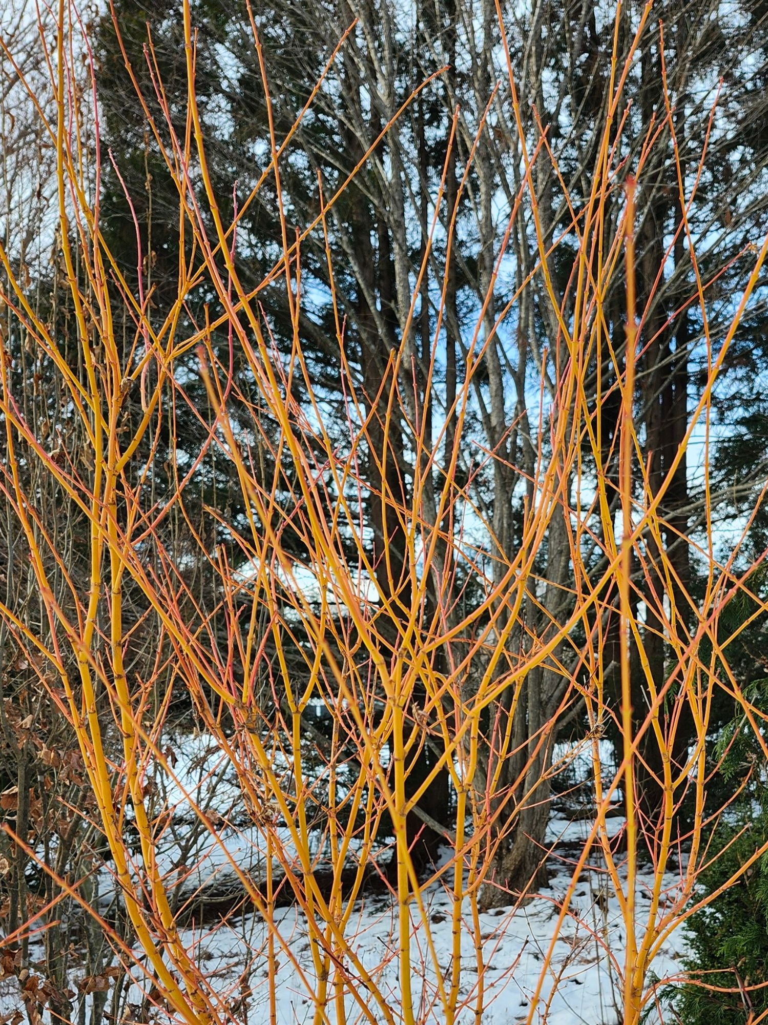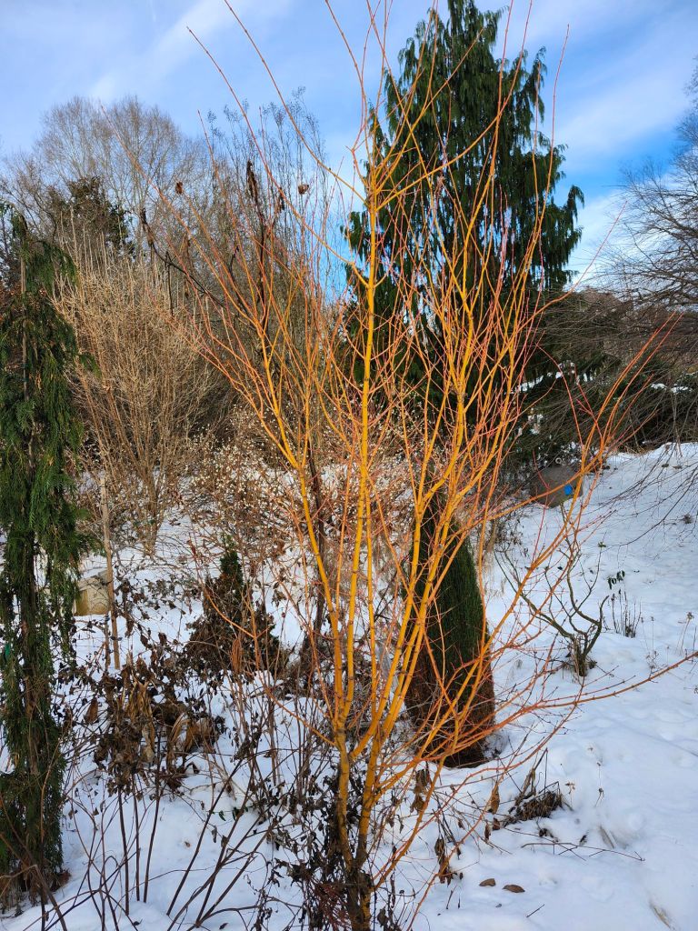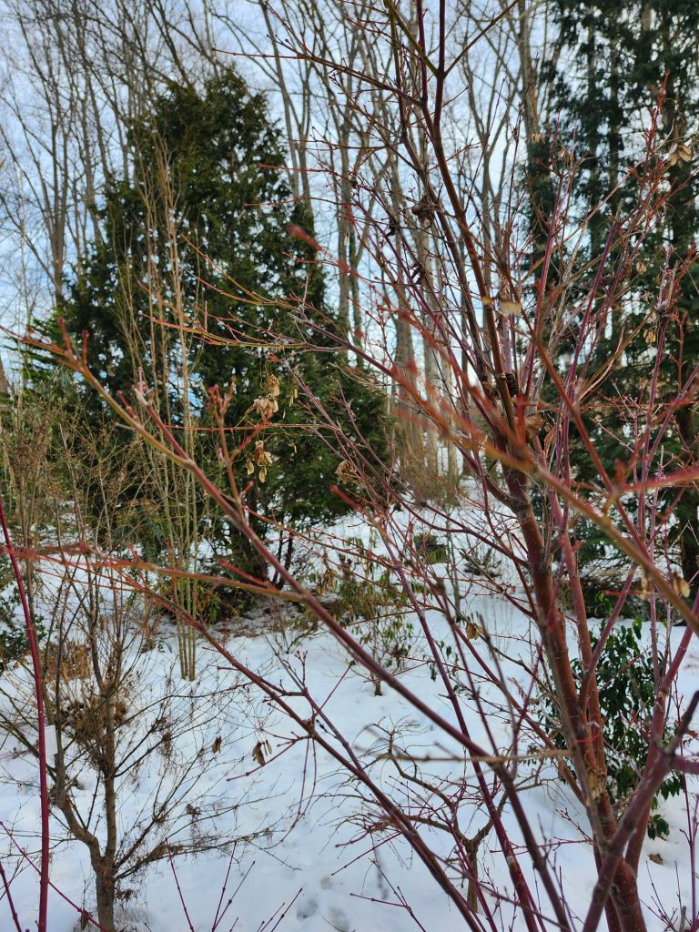 Due to my color vision problems, ornamental bark is not a primary consideration for plant selection in this garden, but the Japanese maples drop are worthy additions. I’ve planted a number of winter flowering shrubs and bulbs, and the colored bark is another reason to explore the garden on a snowy January afternoon.